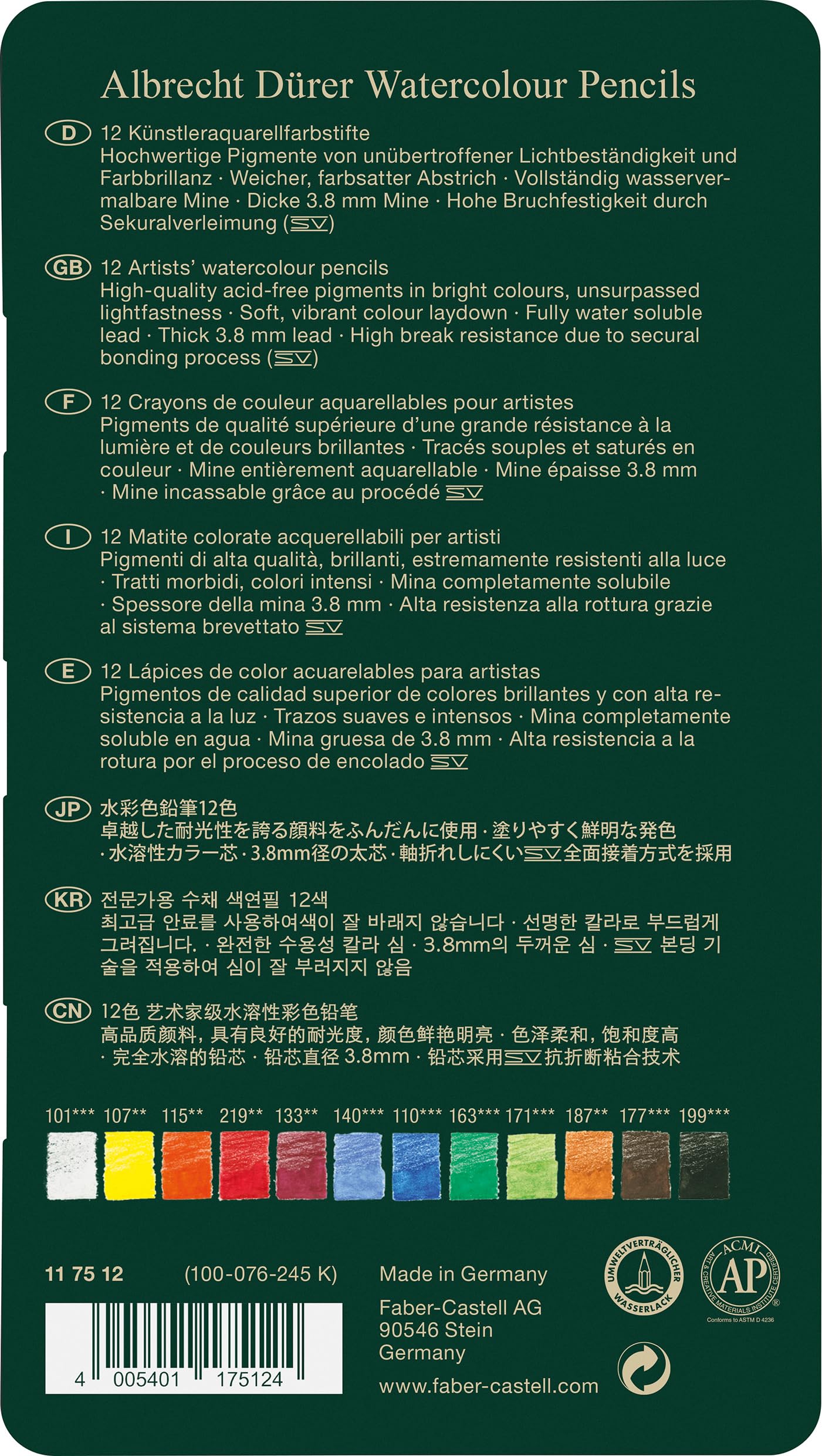 ["AQUARELLSTIFTE SET: With 12 vibrant colors perfect for drawing, shading, and painting – compactly packaged in a metal case that is always at hand","BEAUTIFUL WATERCOLOR EFFECTS: Be enchanted by vivid watercolor effects – with Faber Castell watercolor pencils that masterfully mimic the brilliance of traditional watercolors","SEAMLESS COLOR GRADIENTS: Thanks to the water-soluble pigments of these watercolor pencils, your artworks transform with just a few brush strokes into flowing, vivid watercolors","DURABLE: With their sturdy 3.8mm leads and innovative SV bonding, the watercolor pencils offer maximum break resistance – for carefree, long-lasting painting fun","FABER-CASTELL: Enriches life with creativity and self-expression, inspires confidence and joy through practical, innovative products for all age groups"]
