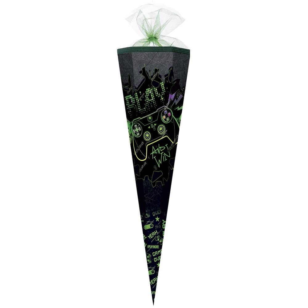 ["Included (8 pieces): Gamer school backpack, gym bag, pencil case (unfilled), snack box, plastic water bottle, notebook box (DIN A5), rain cover, cone-shaped school cone (6-sided | Diameter approx. 20cm | Length approx. 85cm)",