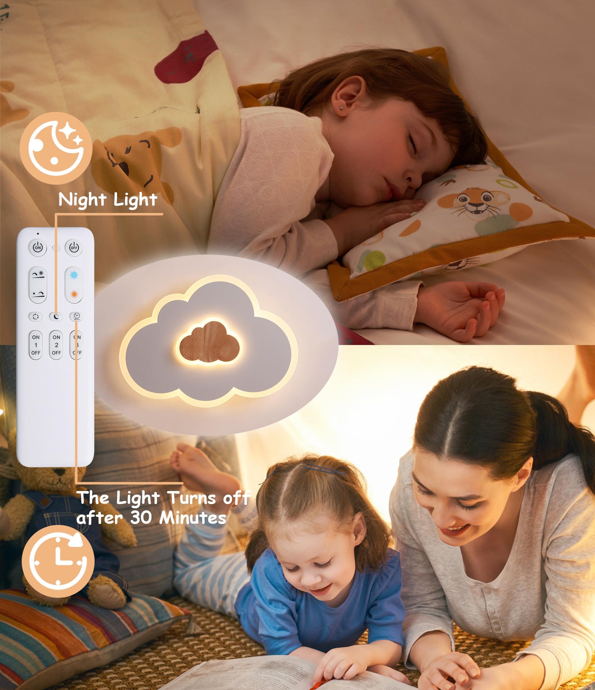 ["Cloud Lamp Fashion Design: Length 500 mm, Width 369 mm, Height 50 mm, the creative ceiling lamp takes the form of clouds and embedded wooden blocks as decorations, which can adorn the children's room and also illuminate your room in the darkness.","Night Light and Timer Function: The night light mode of the bedroom ceiling light can be set by remote control and wall switch. The light in night light mode is very soft and suitable for bedrooms and children's rooms. Set the timer function via the remote control and the light will automatically turn off after 30 minutes.","Dimmable Function: Switch between the three color temperatures of the ceiling light (3000K Warm White, 4500K Neutral White, 6000K Cool White) freely via the wall switch and remote control to meet your different needs. With the remote control, you can adjust the brightness of the bedroom ceiling light in a range of 10%-100%.","High-quality Energy-saving LED: The wooden ceiling lamp uses high-quality built-in LED chips with a power of up to 26W, but an ordinary bulb with a brightness of 130W, saving 80% of electricity; its lifespan is also as long as 30,000 hours.","Wide Application: The Cloud Ceiling Light is equipped with beautiful and cute clouds, suitable for installation in children's rooms, offices, bedrooms, and living room lights. You can also use it as a wall lamp."]
