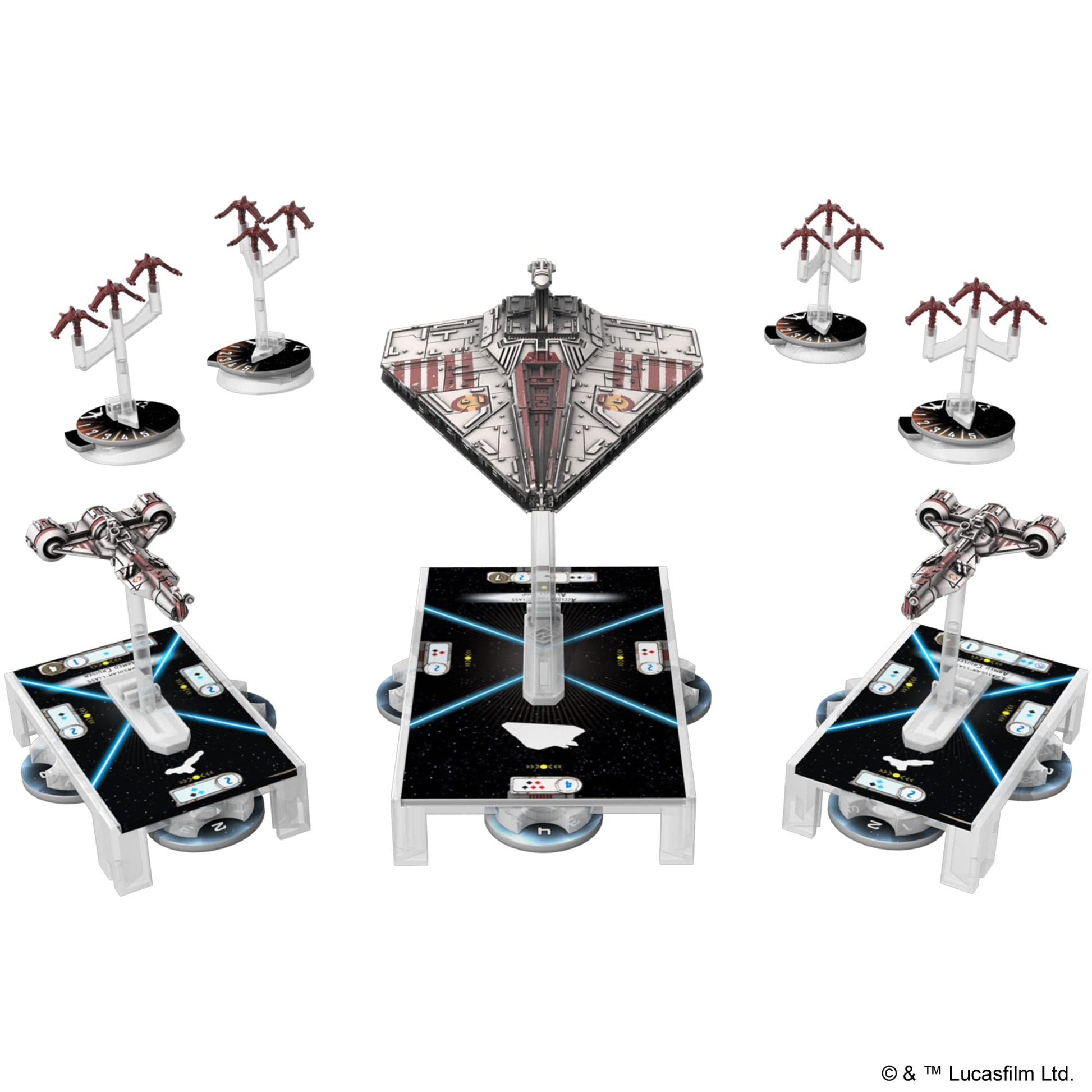 ["War! The old Jedi Order has led to the stars to defend the Galactic Republic. As the threat of the Separatist Alliance spreads and leaves plundered worlds and petty tyrants in its wake, the Republic Fleet is often outnumbered numerically, but never surpassed.","This Fleet Starter sets the foundation for your fleets of the Galactic Republic by putting you in command of a powerful Acclamator-class Assault Ship and two mighty Consular-class Cruiser miniatures.","Rebel and Imperial fleets battle for the fate of the galaxy in Star Wars: Armada, the two-player miniature game of epic space battles.","You'll find all the components necessary to start playing.","English Version | 2 Players | Ages 14+ | 120 minutes playtime"]