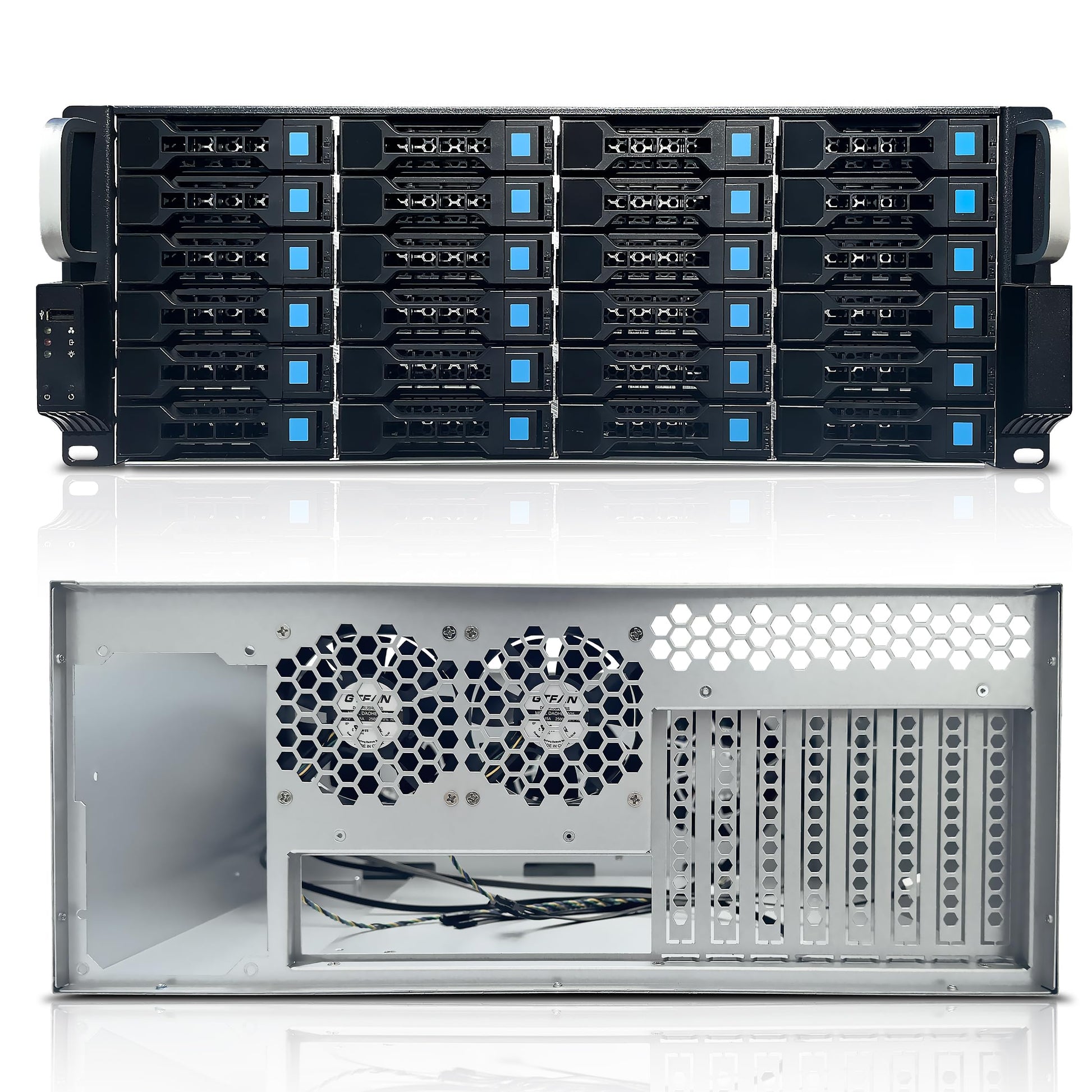 ["Storage enclosure for installation in 19\" industry cabinets. Robust construction and high-quality workmanship. Mainboard types: M-ATX, ATX, E-ATX, SSI CEB, SSI EEB", "6x SFF-8087: 12x SAS/SATA to 3x SFF-8087 per backplane, 5x 4PIN Molex power connectors per backplane", "24x yellow power LED for operation status, 24x blue status LED for hard drive access", "Supports SATA/SAS 6Gbit/s connections (backwards compatible); 7xPCI slots; 1.0mm SECC Zinc Steel, silver", "Package includes: SRC-4240X07 storage enclosure, USB cable with pin assignment, screws"]