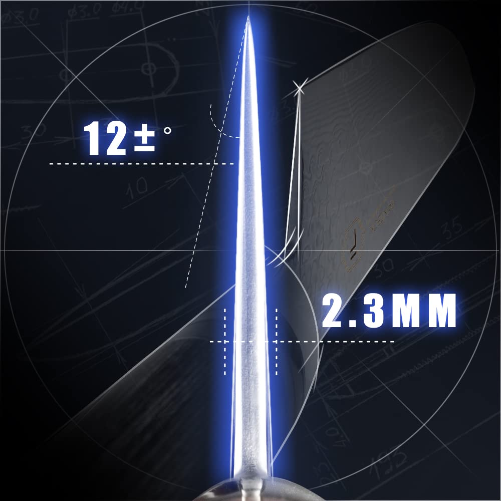 ["High-quality VG10 Damascus steel blade】The professional kitchen knife made of high-quality carbon stainless steel and contains 0.99% carbon, 15.03% chromium, 62+ Rockwell hardness. It has high corrosion resistance, high hardness, wear resistance. Vacuum heat treatment and nitrogen cooling technology are implemented to obtain the best characterization of the steel.","【Multifunctional Damascus knife】With a sharp cutting angle of 15°, this 9.5-inch Damascus knife is designed for various purposes and professional applications such as chopping, slicing, and dicing with a razor-sharp edge. Ideal for effortlessly cutting meat or fruits and vegetables. Furthermore, the blade of the kitchen knife is double-sided, making the chef's knife suitable for both right and left-handers.","【Exquisite gift box】Japanese knife with a small knife sharpener will complete all kitchen tasks well, and a professional chef's knife with an exquisite gift box is very suitable as a gift for parents and friends for occasions such as Father's/Mother's Day, Black Friday, Christmas, New Year, Halloween, Thanksgiving Day, Birthday, etc.","【Satisfaction Guarantee】We offer you a 100% satisfaction guarantee. If you have any problems, please contact us and we will refund or replace your purchase! Lifetime warranty on material and/or manufacturing defects. Buy without risk."]