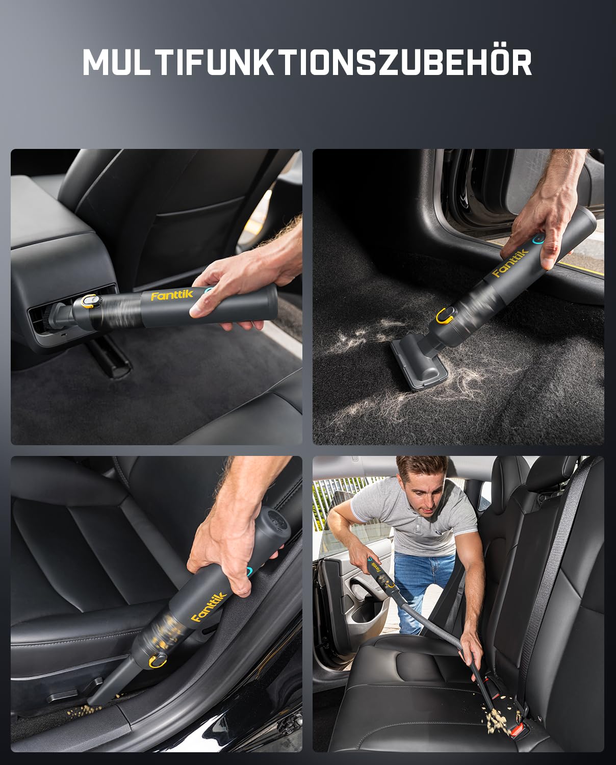 ["This handheld vacuum cleaner is compact and therefore not suitable for cleaning large areas. It is ideal for cleaning details in the car interior as well as details in indoor areas, office desks, and computer keyboard dust","4-in-1 multifunction mini vacuum cleaner: The wireless handheld vacuum Fanttik V8 Apex comes with multiple accessories to meet all your different needs. Vacuuming, blowing, inflating, pumping","10 accessories for wireless handheld vacuum: Crevice nozzle and flexible hose for cleaning hard-to-reach corners, brush attachment for dust removal, multi-surface brush and pet brush for removing pet hair from fabric surfaces","19000Pa suction power: The brushless motor with 80000 rpm provides a maximum suction power of 45AW/19kPa, making it easy to vacuum up dust and dirt. The car vacuum cleaner has two suction modes, 40 mins in Eco mode and 13 mins in Max mode","Ultra-lightweight: Weighing only 498g, equivalent to a water bottle, you can easily handle sand, dust, and car corners with one hand using the wireless handheld vacuum. Small and portable storage bag for easy storage","Empty with just one touch: With just one touch, the lid opens automatically and empties the dust. The HEPA filter of the car vacuum cleaner captures up to 95.99% of dust and particles","Type-C charging and quick charging: With the universal Type-C charging cable, the car vacuum cleaner can be fully charged in 2.5 hours. You can charge it in the car or use a standard charger, computer, or various storage devices"]