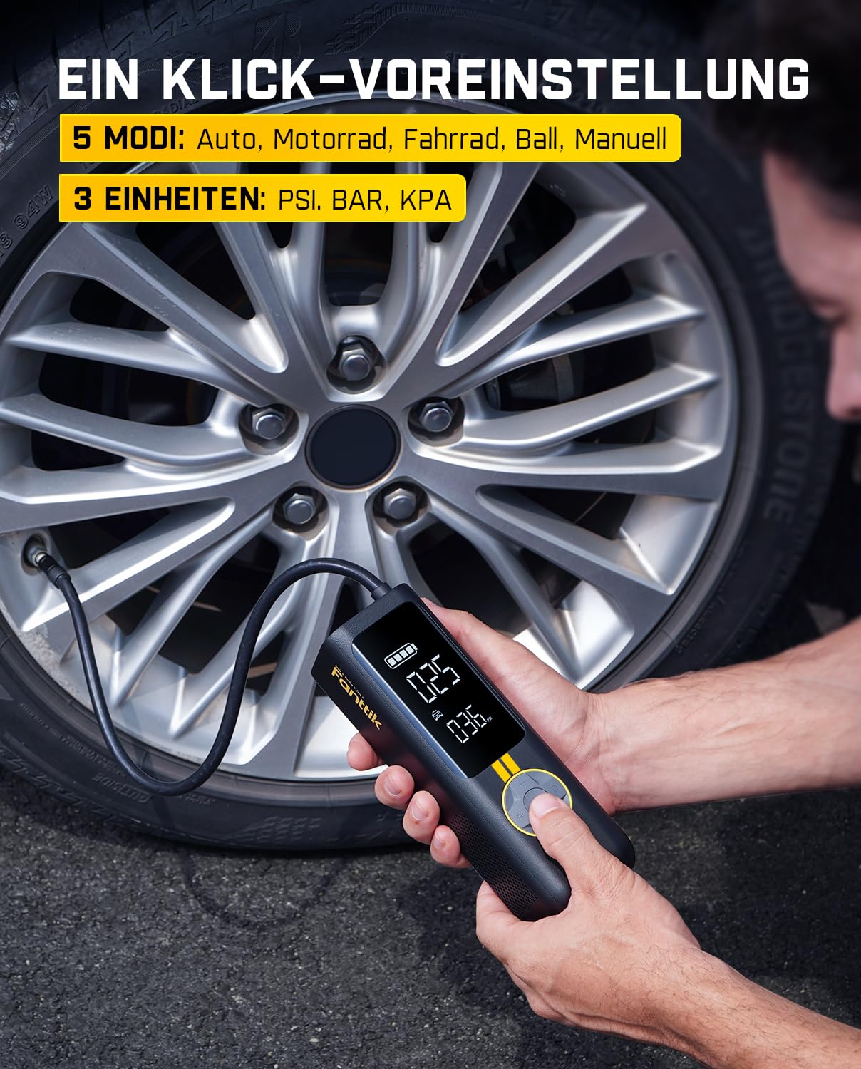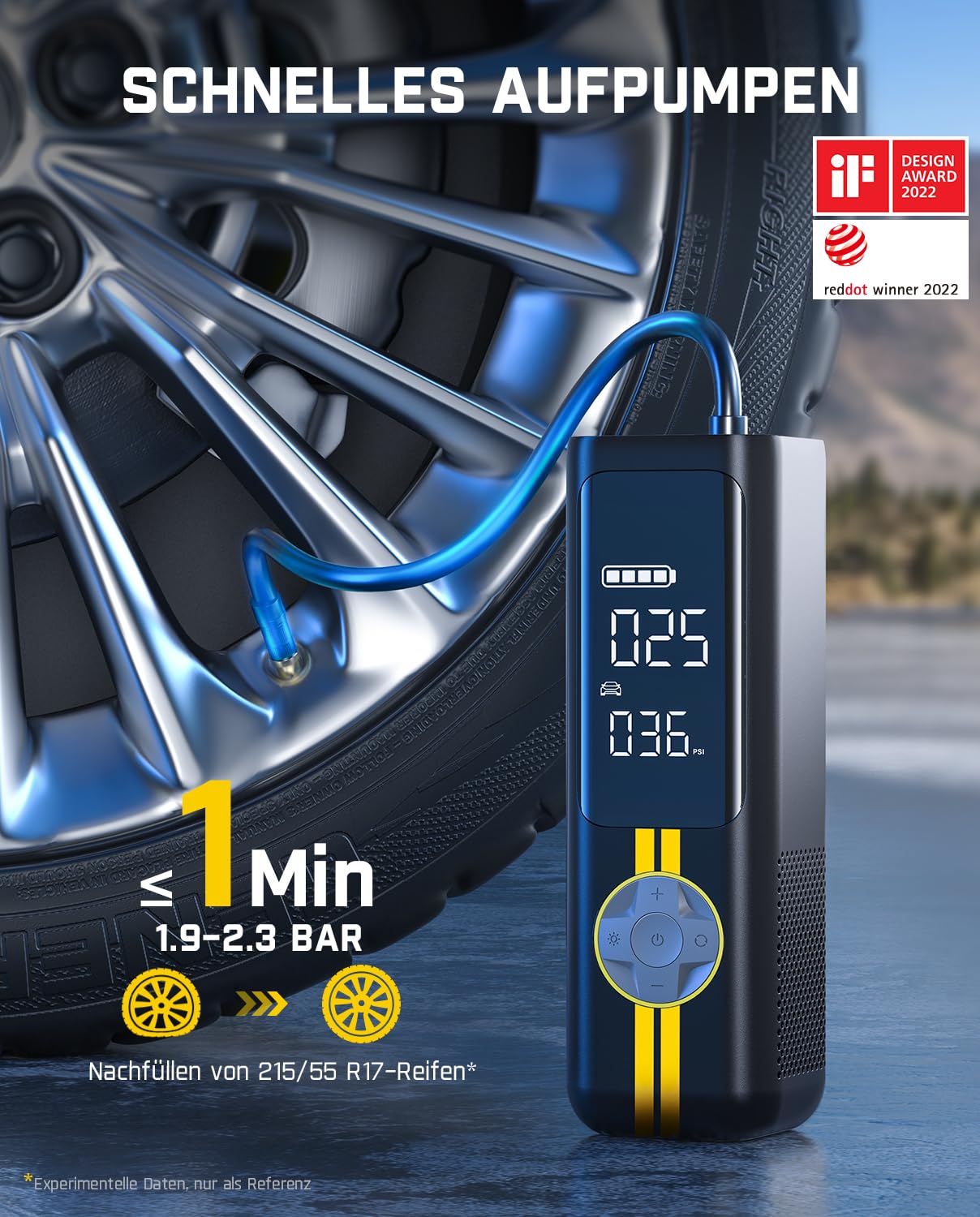 ["56 Seconds Faster Inflator: The fastest rechargeable 11.1V battery air pump on the market. Inflating 26.3 inch tires of medium-sized cars only takes 56 seconds (press and hold the conversion button on the right to change the unit). Inflation is precise with an inflation accuracy of ±0.1 BAR","Up to 40 Minutes Powerful Battery Life: X8 APEX has a 6000 mAh battery (2000 mAh x 3). At typical outdoor temperatures, the X8 Apex can work continuously for 40 minutes on a full charge. With the proprietary cooling function, 16 tires can be continuously inflated without a break","Pre-set Tire Pressure, Intelligent Control: It offers 4 pre-set inflation modes (bicycles, motorcycles, cars, and balls) and press and hold the right button to change the units PSI➡KPA➡BAR. With just one click, you can select the desired inflation mode and the philosophy is ready. When the pre-set pressure value is reached, the battery air pump stops automatically","All in One - Air Pump, Power Bank, and Flashlight: 2 LED light modes make it easier to inflate and change tires in the dark. A 5V/3A USB C input and 5V/2A USB A output port can provide emergency power for your mobile phone. The mini air compressor measures only 20 * 6.4 * 6.4 cm and weighs only 0.2 pounds. Thanks to its compact size, it easily fits in your car, bike carrier, or backpack","Flexibility for Inflating from Any Angle: X8 Apex comes with an 18.11 inch long high-pressure hose with scald protection, easily covering Sub-R22 tires at 10.3 BAR / 150 PSI high pressure. This allows for easy inflation from all angles, even from difficult directions"]