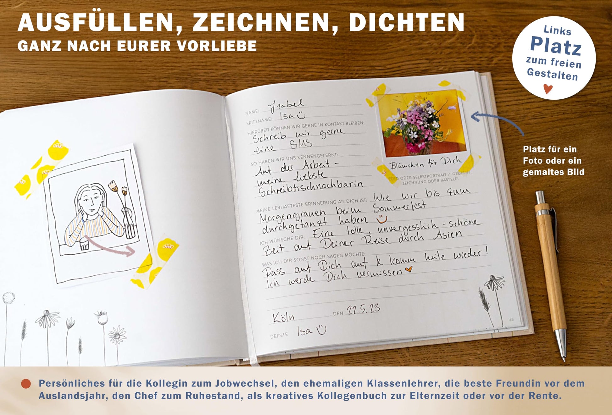 "THE GOOD PART: Your personal farewell letters, best wishes, and funny anecdotes will be stylishly collected and framed as small treasures – a profile book for farewells with plenty of space for photos, individual vouchers, small drawings, and poems",