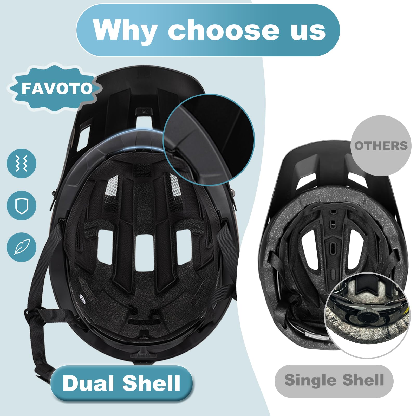 ["MTB bike helmet with visor - The carefully designed, thicker and longer visor provides comprehensive eye and impact protection, preventing mud, branches or other particles from directly hitting the rider's eyes and forehead while cycling. The high-quality metal screw buckle ensures secure attachment without additional tools.", "Double Inmould Technology - The PC double-shell design enhances durability and provides outstanding impact protection. The high-density 20mm EPS foam absorbs and distributes impact forces effectively, ensuring reliable head protection.", "Comfortable design - With an elastic band on the back for easy hanging and quick removal of sports goggles. The high-quality moisture-wicking lining is lightweight, breathable, and can be easily removed and cleaned to ensure a clean and cool riding experience. The mountain bike helmet weighs only 335 g, reducing pressure on the head even during longer wear.", "Universal MTB helmet - The one-handed adjustment knob and interior padding ensure a perfect fit for your head. The bike helmet is suitable for various head sizes and is suitable for most teenagers and adults. Recommended head circumference: 59-61 cm (measure your head before purchasing).", "Favoto Allround Helmet - Specially designed for various road and mountain biking activities, especially for endurance and off-road rides. The removable visor also makes it ideal for commuting in urban and suburban areas."]