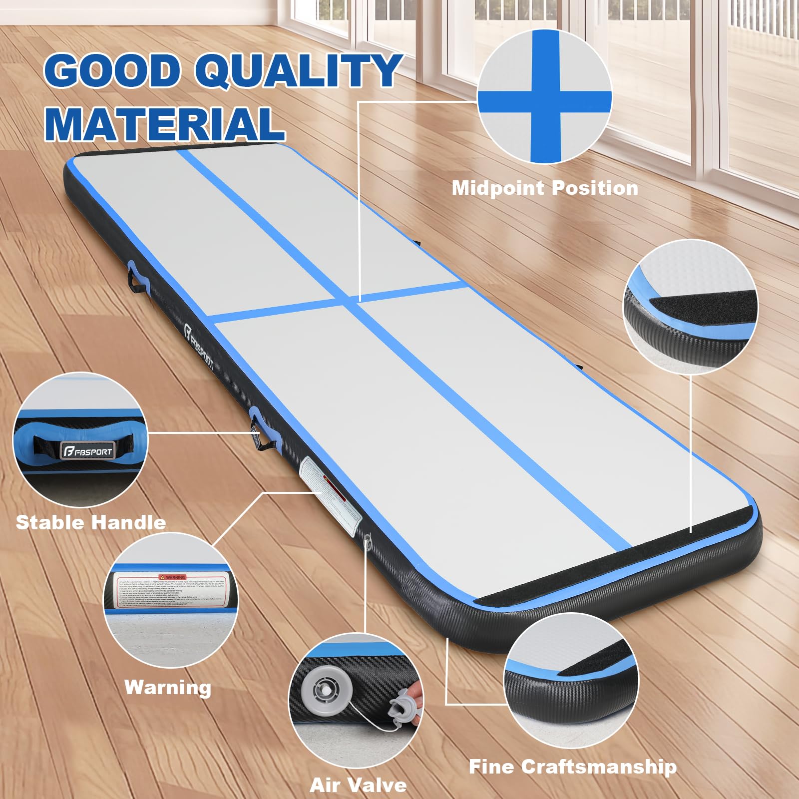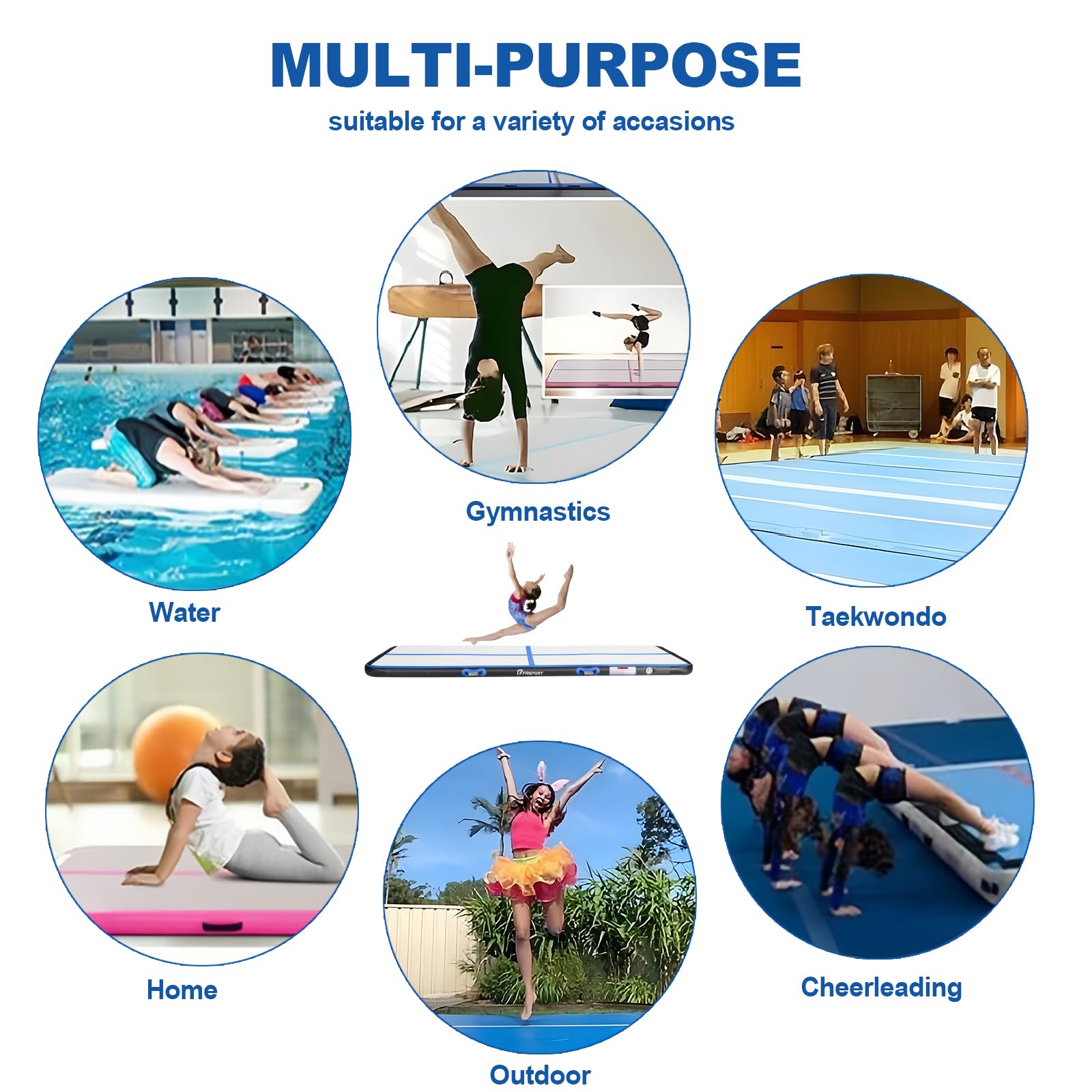 "4/8 inches thick for optimal comfort: Thanks to the special design, the inflatable gymnastics mat is 4/8 inches thick. The mat is soft enough to allow for higher jumps and provide you with great comfort and safety during use. That's why you won't easily get injured while training with this gymnastics mat."