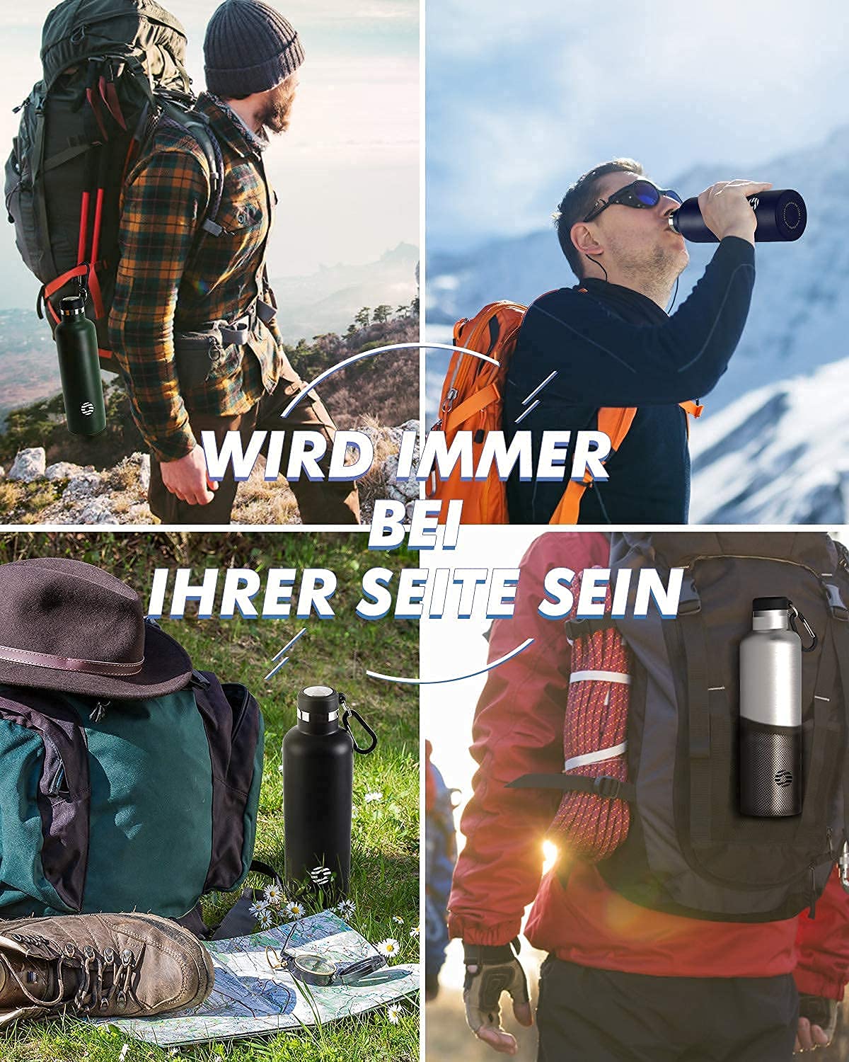 FEIJIAN Stainless Steel Water Bottle 750ml with Carabiner - Leakproof Thermos Flask for Carbonated Coffee Tea, BPA-Free Sports Outdoor Water Bottle for Sparkling Water/University/School/Camping/Biking