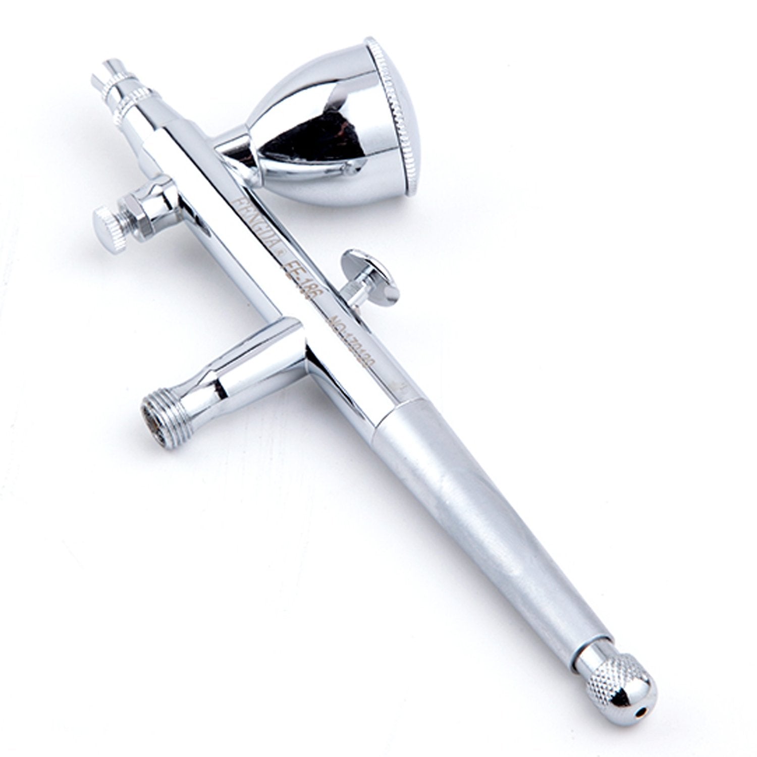 ["Elite design with front micro air control knob", "Three interchangeable gravity cups: 2ml, 5ml, and 13ml", "3 different nozzle sizes: 0.20mm, 0.30mm (installed), and 0.50mm", "Sprays light to high viscosity paints, providing high paint flow with different spray patterns", "Ideal for art, nail art, temporary tattoos, cake decoration, hobbies, crafts, automotive graphics, etc."]