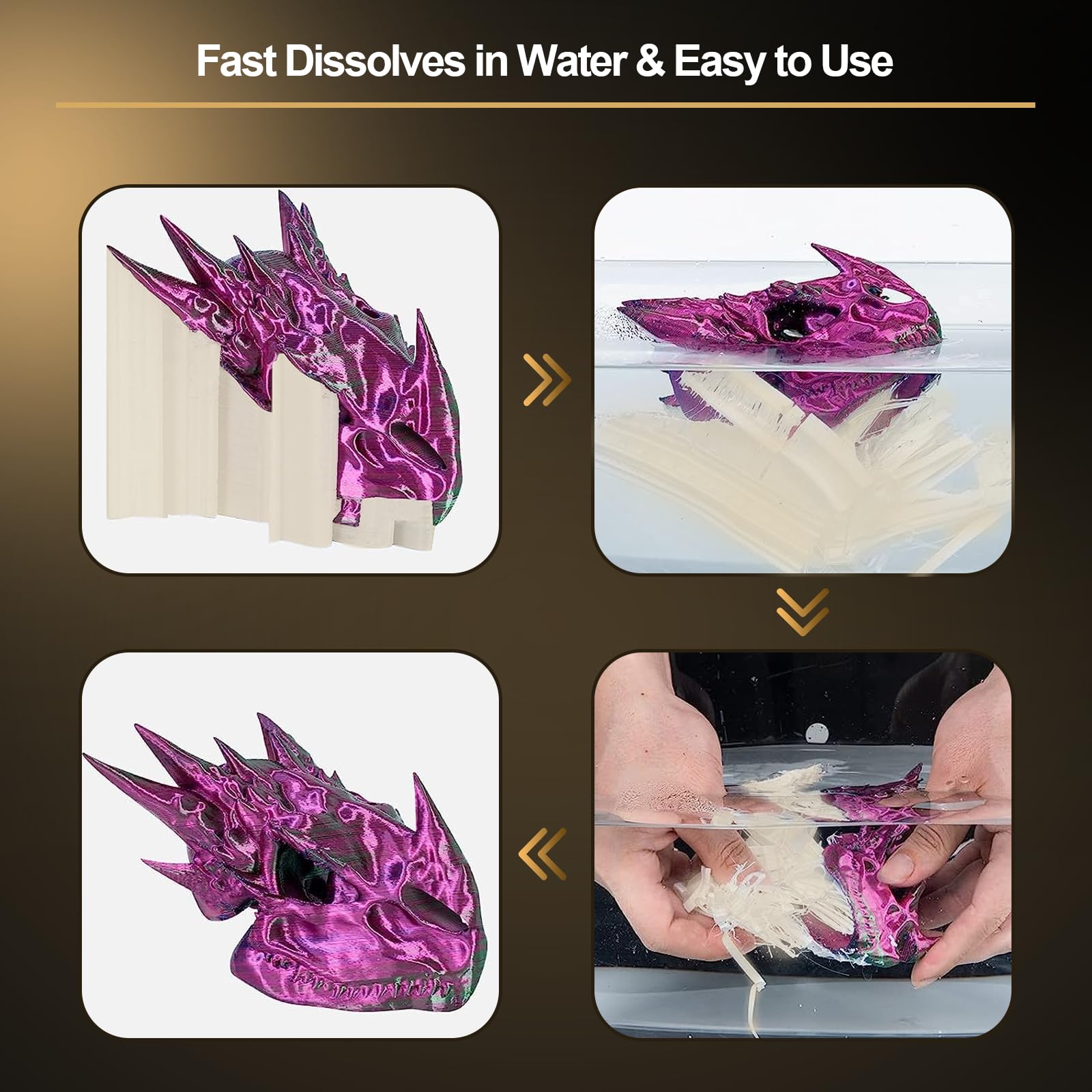 ["Water-soluble Support Filament】Eono PVA Filament can be partially dissolved in warm water (140-176°F), becoming soft and easy to remove from the printed model when used as a support material. Easy to peel off, does not damage the printed surface. Environmentally friendly and non-toxic. Good adhesion on various materials like PLA.","【Good Layer Adhesion and Rigidity】No warping, no clogging, no clumping or layer separation issues. The Eono PVA 3D printer filament is a worry-free product with excellent adhesion to the print bed, very uniform color, and dimensional accuracy.","【Pure Material, Precise Diameter】The Eono PVA filament comes in a full 1KG spool, perfect roundness, and a diameter tolerance of 0.03 mm. It is neatly wound to avoid printing errors, clogs, and tangles, ensuring a smooth print surface.","【Recommended Settings】We recommend printing the PVA filament at a nozzle temperature of 374-464°F, bed temperature of 122-149°F, and print speed of 1.97-3.94 inches/s. The size of the EONO Filament 1.75 PVA is suitable for many FDM 3D printers.","【Vacuum Sealed Packaging】The EONO 3D printer filament is delivered in vacuum-sealed packaging with a desiccant to protect it from moisture and dust. If you encounter any problems, feel free to contact us. EONO will assist you wholeheartedly"]