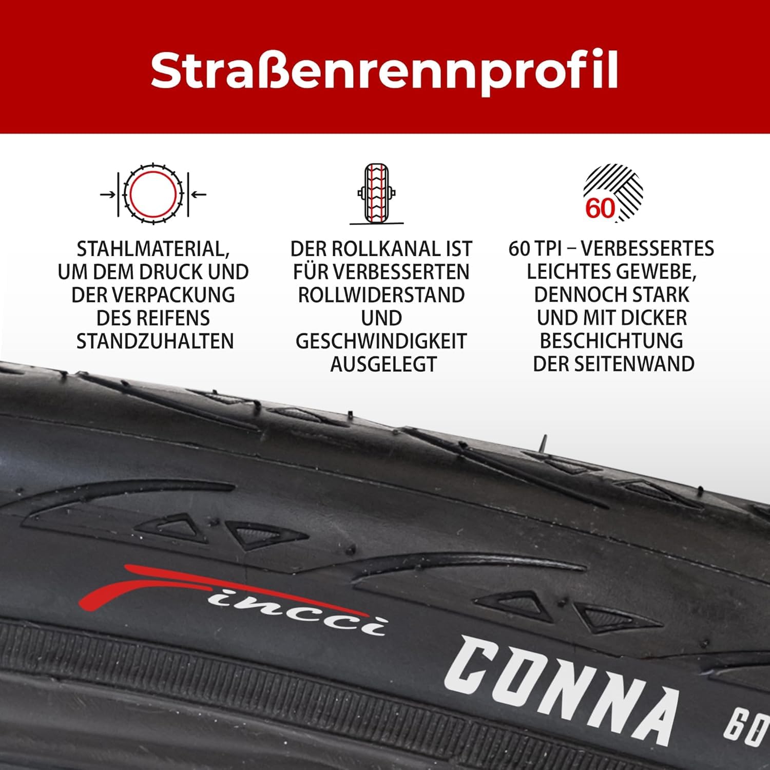 "Paket besteht aus 2x Reifen Conna und 2x fahrradschlauch 28 Presta. Hochwertiger Schwarz Fahrradreifen im Format 700x23c mit ETRTO 23-622. Dieser Reifen ist speziell für Räder, Rollentrainer mit 700c-Größe, 28 - 29 zoll geeignet und bietet eine zuverlässige Leistung.
