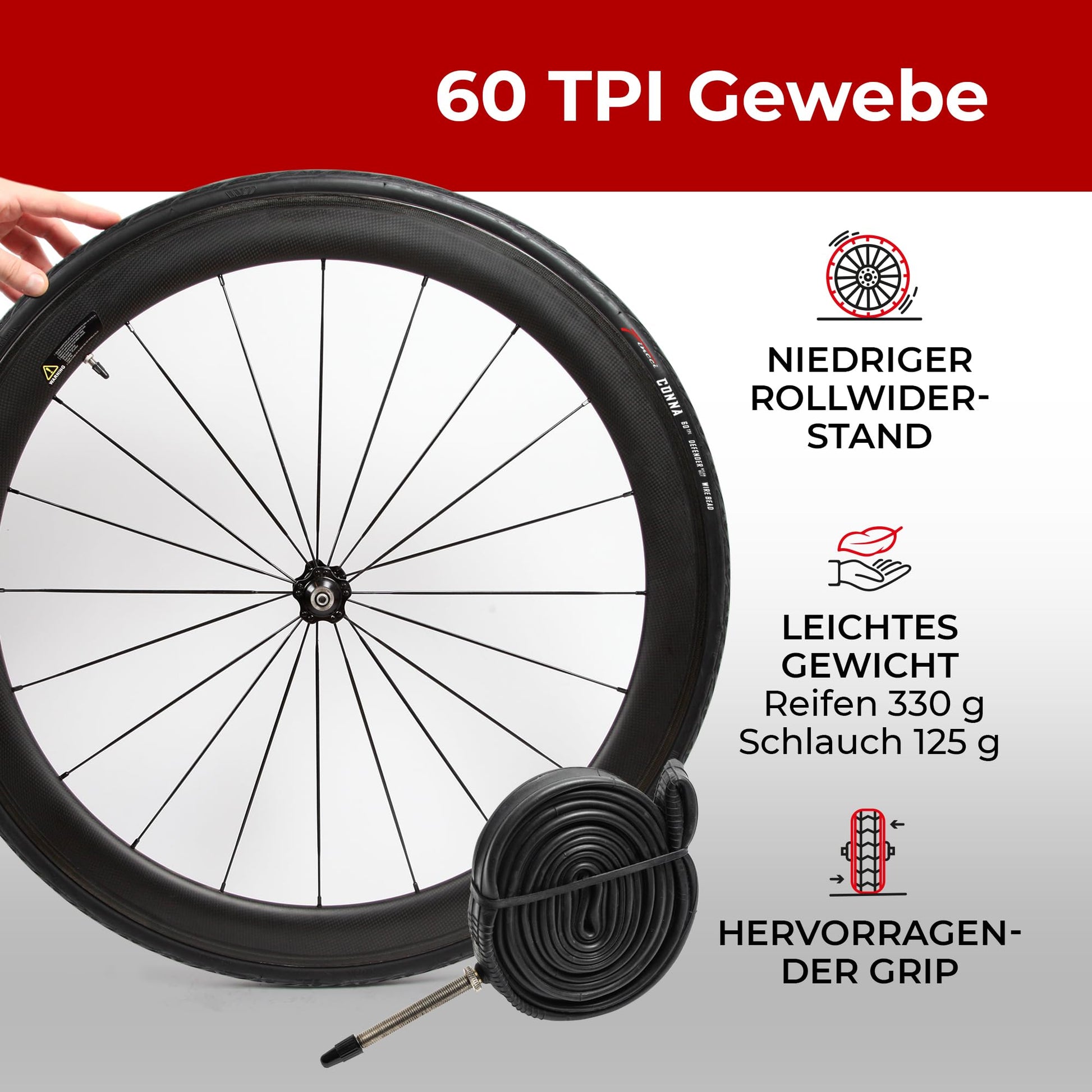 Jeder Reifen wiegt 330 g und hat eine TPI von 60 für eine optimale Balance zwischen Gewicht und Haltbarkeit. Eine 1 mm dicke Schicht aus flexiblem Gummi bietet einen dauerhaften Schutz vor scharfen Gegenständen.