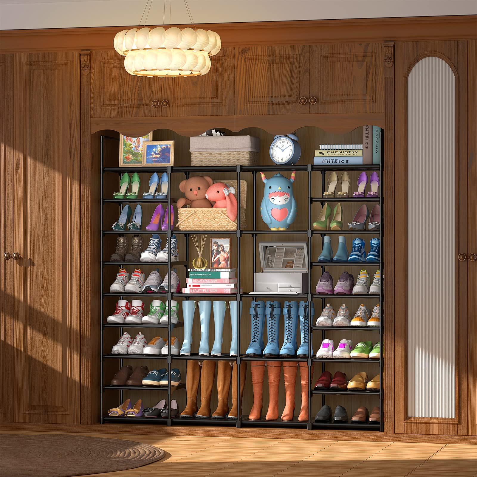 ["Large shoe rack with 9 tiers - 66.1 x 12 x 62 inches, 4-row shoe rack with 9 tiers can store 64-72 pairs of adult shoes, including flat shoes, running shoes, sneakers, high heels, boots... Doesn't wobble or tip over, even when fully loaded with 72 pairs of shoes! Sturdy shoe rack with additional 2 rows of side hooks (10 hooks) for perfect hanging of keys, umbrellas, sock bags, and more.","DIY shoe racks for bedroom closet - Each individual layer is about 6.5 inches high, you can freely assemble to create a tall grid for high-top sneakers and boots. Split into 2 or more shoe storage stands or DIY adjustable shoe holder racks in different shapes. Therefore, the freestanding shoe rack organizer can be placed in various locations to organize your shoes.","High-quality materials and Stable structure - The large shoe rack is made of 0.5-inch metal tubes and high-quality PP connectors, ensuring that our large heavy-duty shoe rack maintains a stable structure. Each shoe rack has passed the mechanical test, can withstand up to 119 pounds of objects. The sturdy tubes are coated with black anti-rust coating, significantly improving the lifespan. We provide 8 PP cover sheets, waterproof and easy to clean.","Space-saving and easy to assemble - 4 rows, 9 tiers, shoe rack for the entrance area is a great storage for your shoes, boots, books, toys, or other accessories. Keeps your limited space organized.","Buy with confidence - FINEW offers professional customer service. If you have any questions about our shoe rack, please feel free to contact us, we will provide full replacement ASAP! Tips: Soak the plastic part in warm water before use and use a wooden hammer for smoother installation."]