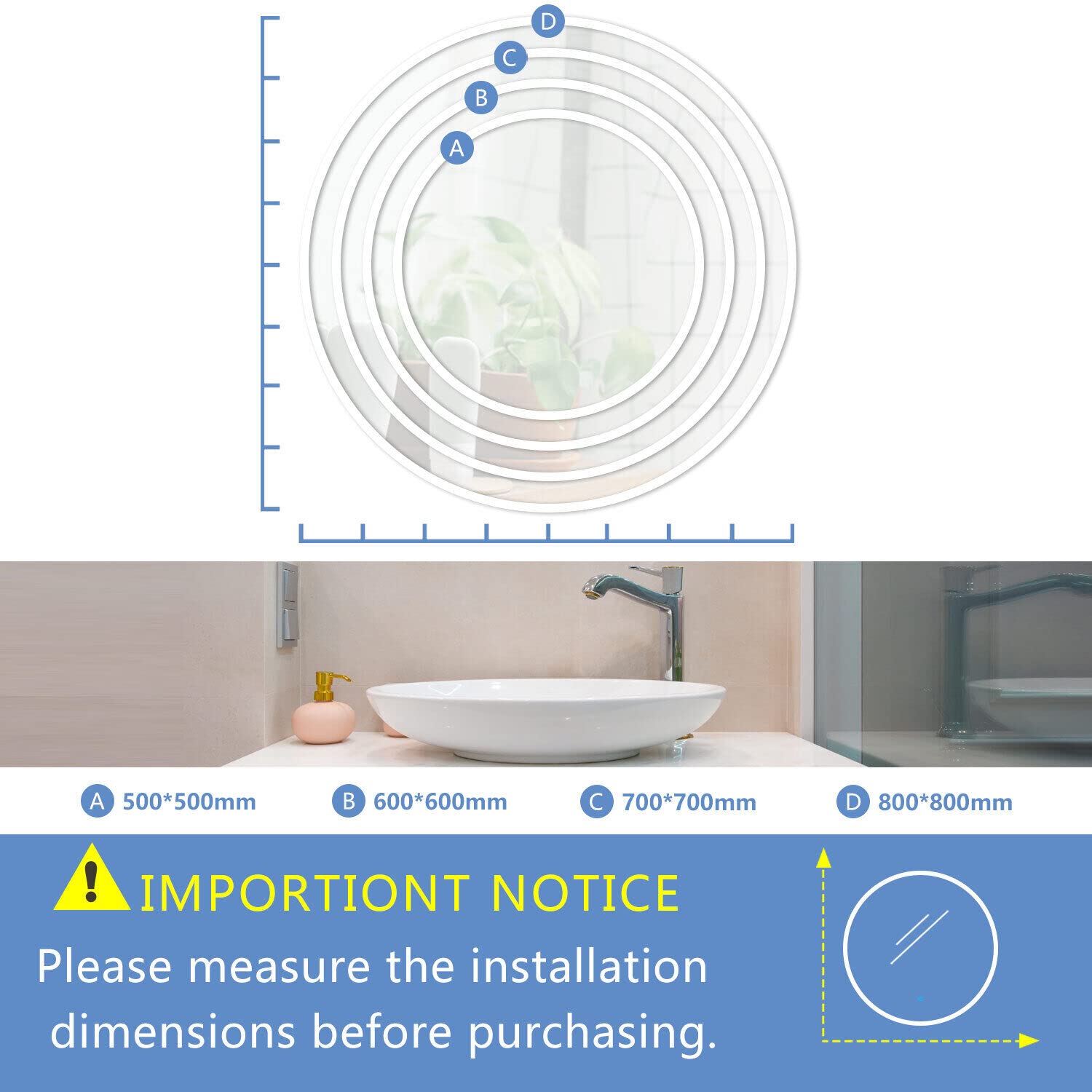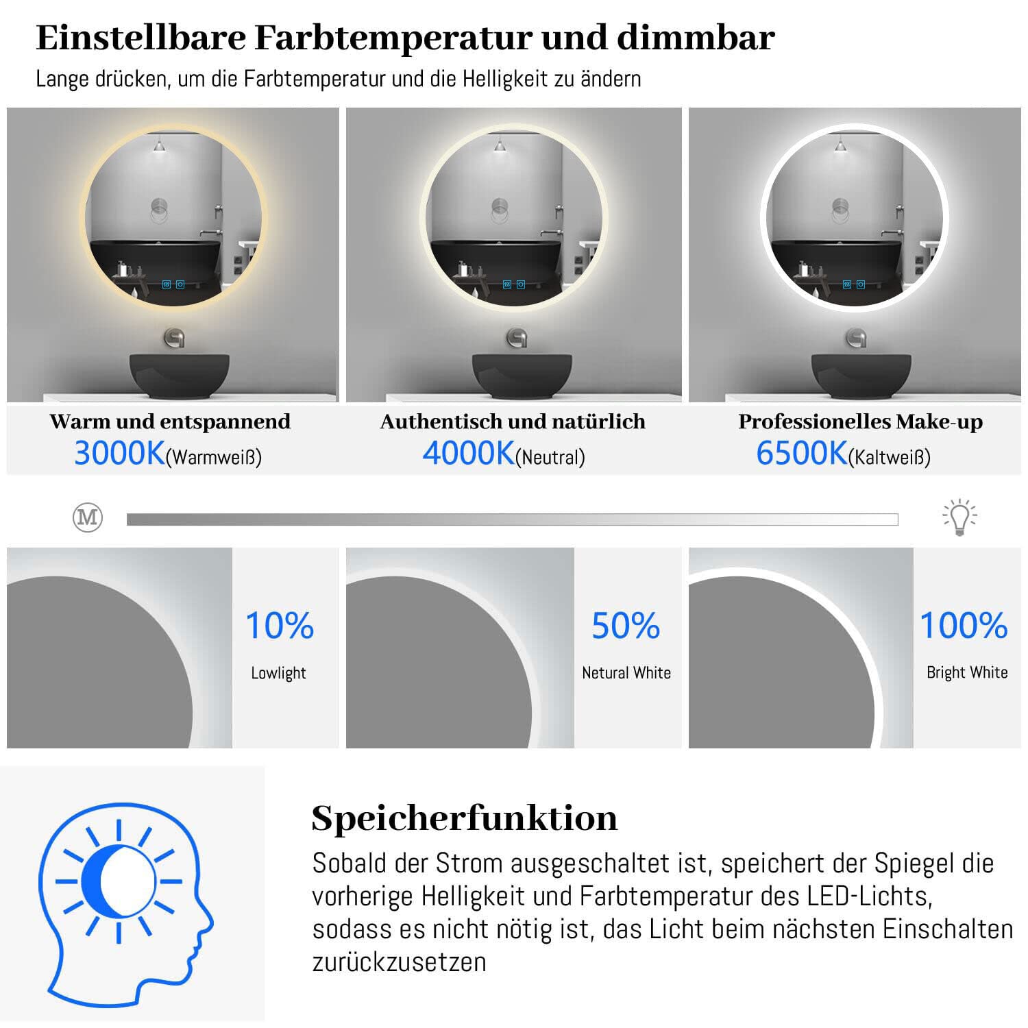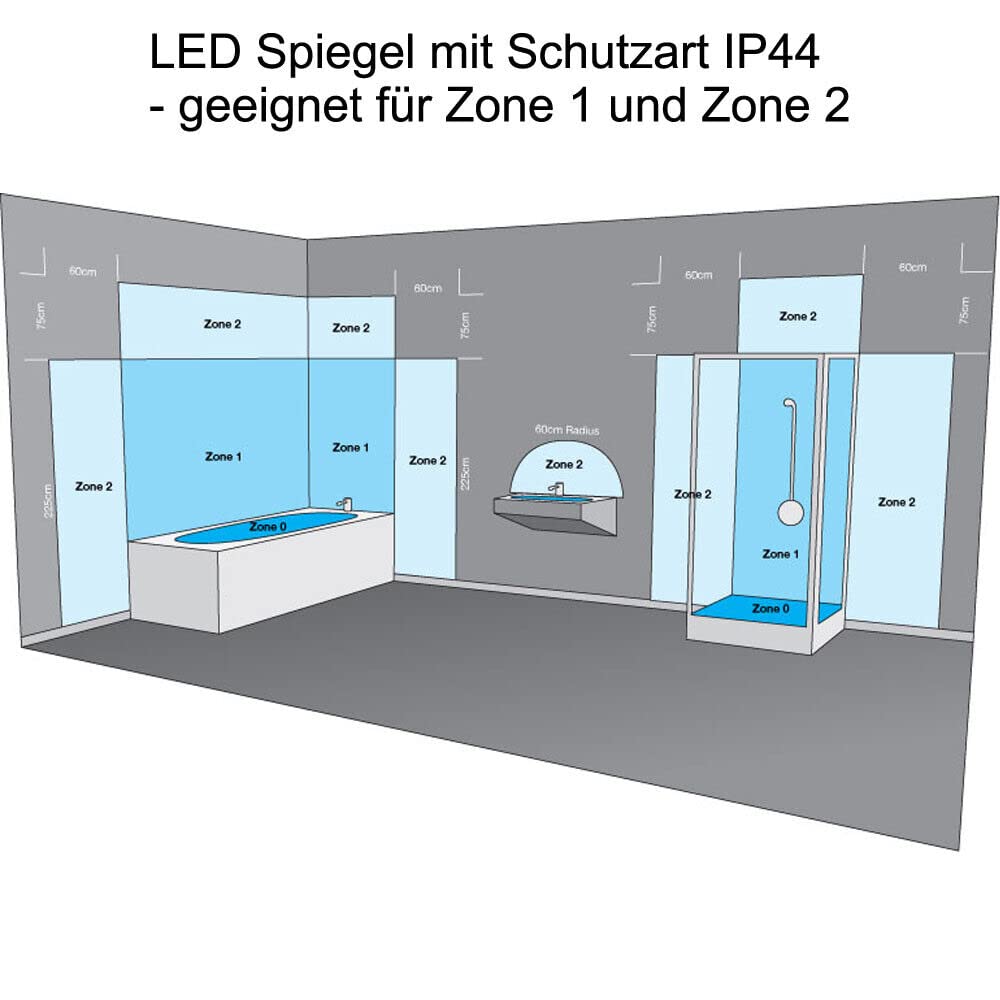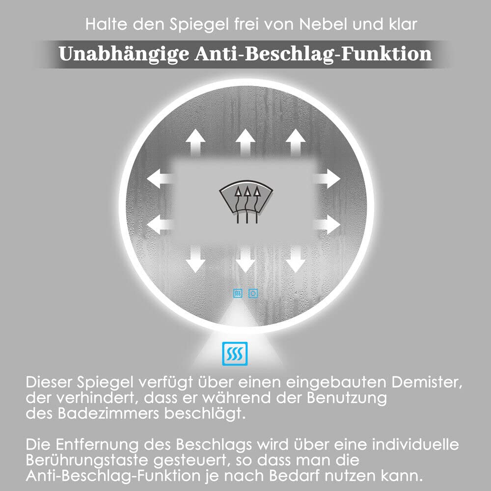 ["Decorative round bathroom mirror with lighting: The large, illuminated mirror creates a cozy atmosphere with gentle, elegant light. Ideal for double sinks and as a stylish focal point in the bathroom","Round bathroom mirror with dimmer and color change: This mirror offers dimmable lighting in cool white, warm white, and warm light. You can adjust brightness and light color as needed. The memory function keeps your settings ready for a perfect feel-good ambiance","Anti-fog round bathroom mirror with lighting: The mirror defogger is controlled independently of the lighting. By pressing the touch button before showering or bathing, the defogger can be activated. This keeps the mirror clear after showering so you can apply makeup or style your hair directly in front of it","Dual control with intelligent auto-off: Our illuminated bathroom mirror has separate buttons for LED lighting and defogging. The buttons glow blue when active and turn off to avoid sleep disturbances. With integrated technology, the mirror automatically turns off after 2 hours to protect the electronics and extend the lifespan","Products and packaging: The CE-certified bathroom mirror with IP44 protection class is waterproof and dustproof. Each LED mirror is packed in a high-quality, reinforced carton and secured with foam to ensure delivery in perfect condition"]