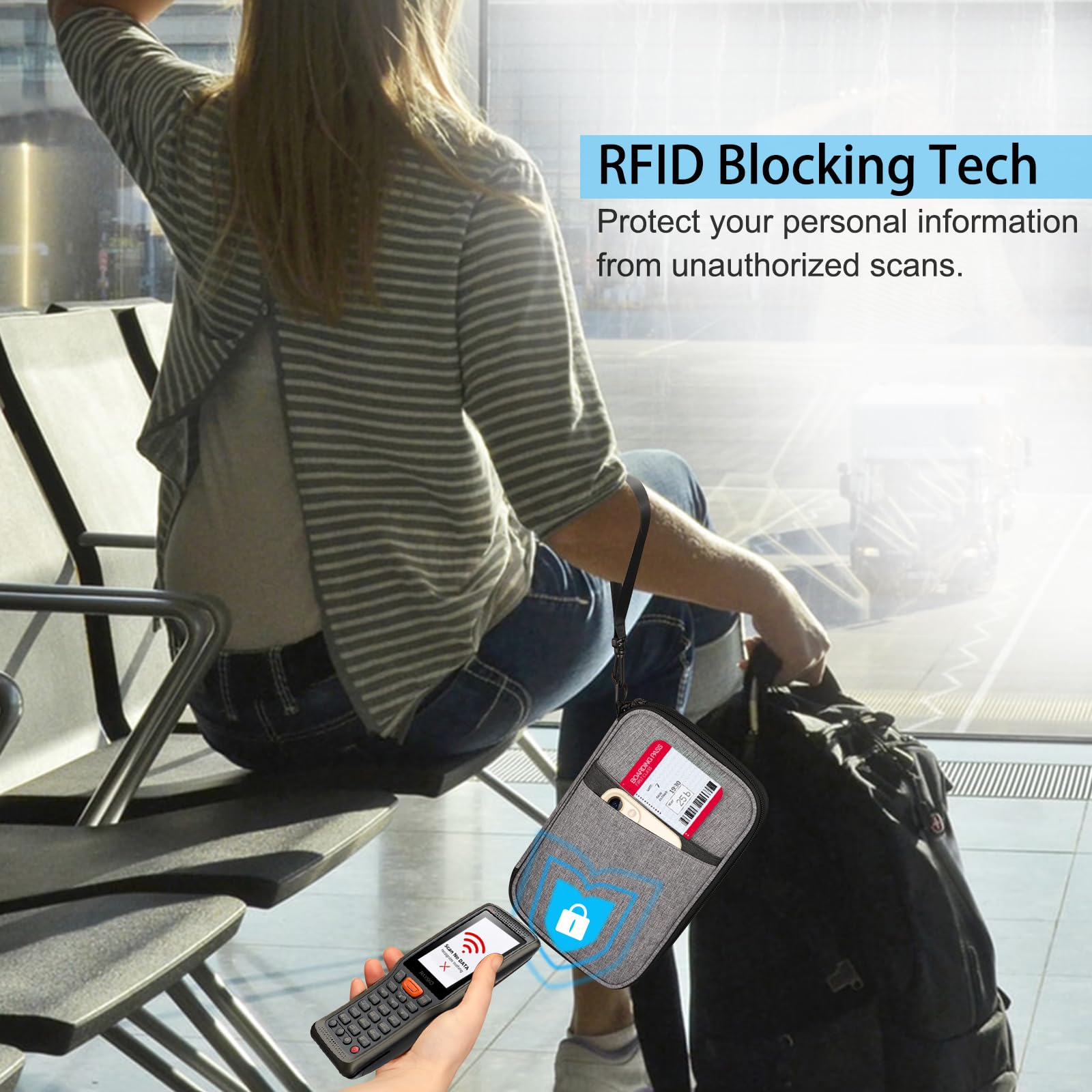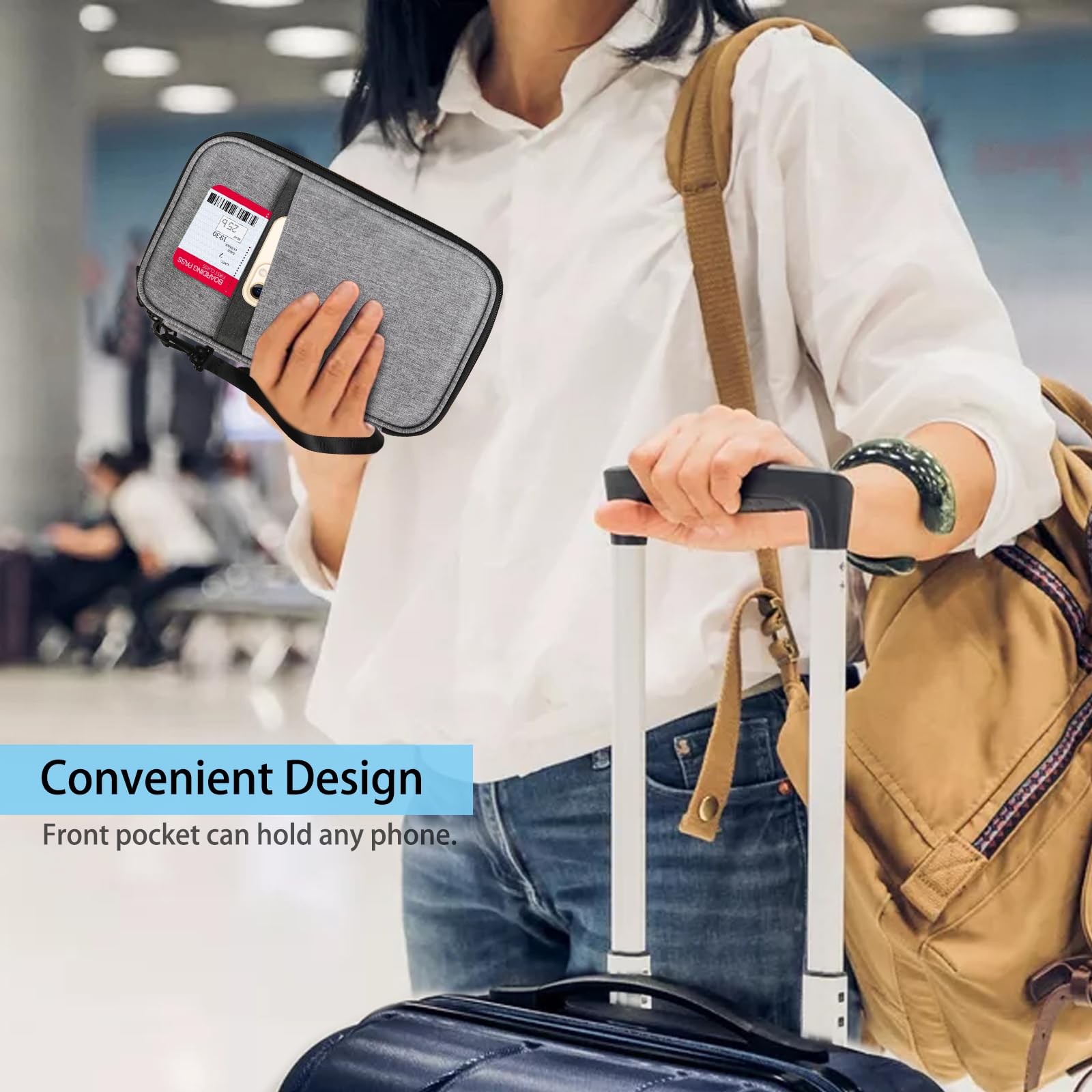 ["【Large Capacity】This passport holder provides an impressive capacity, with enough space for up to 6 passports, 5 cards, and 1 ID. It also offers additional compartments for a phone, cash, coins, pens, and other essential items.","【RFID Protection】With integrated RFID-blocking technology, this passport holder ensures the security of your personal information, prevents unauthorized scanning, and protects against identity theft.","【Portable Design】Designed for comfort and usability, this holder is equipped with both a wrist strap and a shoulder strap, allowing you to choose the carrying style that suits you best.","【High Quality】Made of high-quality polyester fiber materials, this passport holder is lightweight and portable, making it perfect for travel and outings. Its water-resistant properties provide an additional layer of protection against accidental spills or inclement weather.","【Convenient Traveling】The front pocket of this passport holder provides quick access to items such as airport tickets and a phone, ensuring easy organization and having everything you need at hand."]