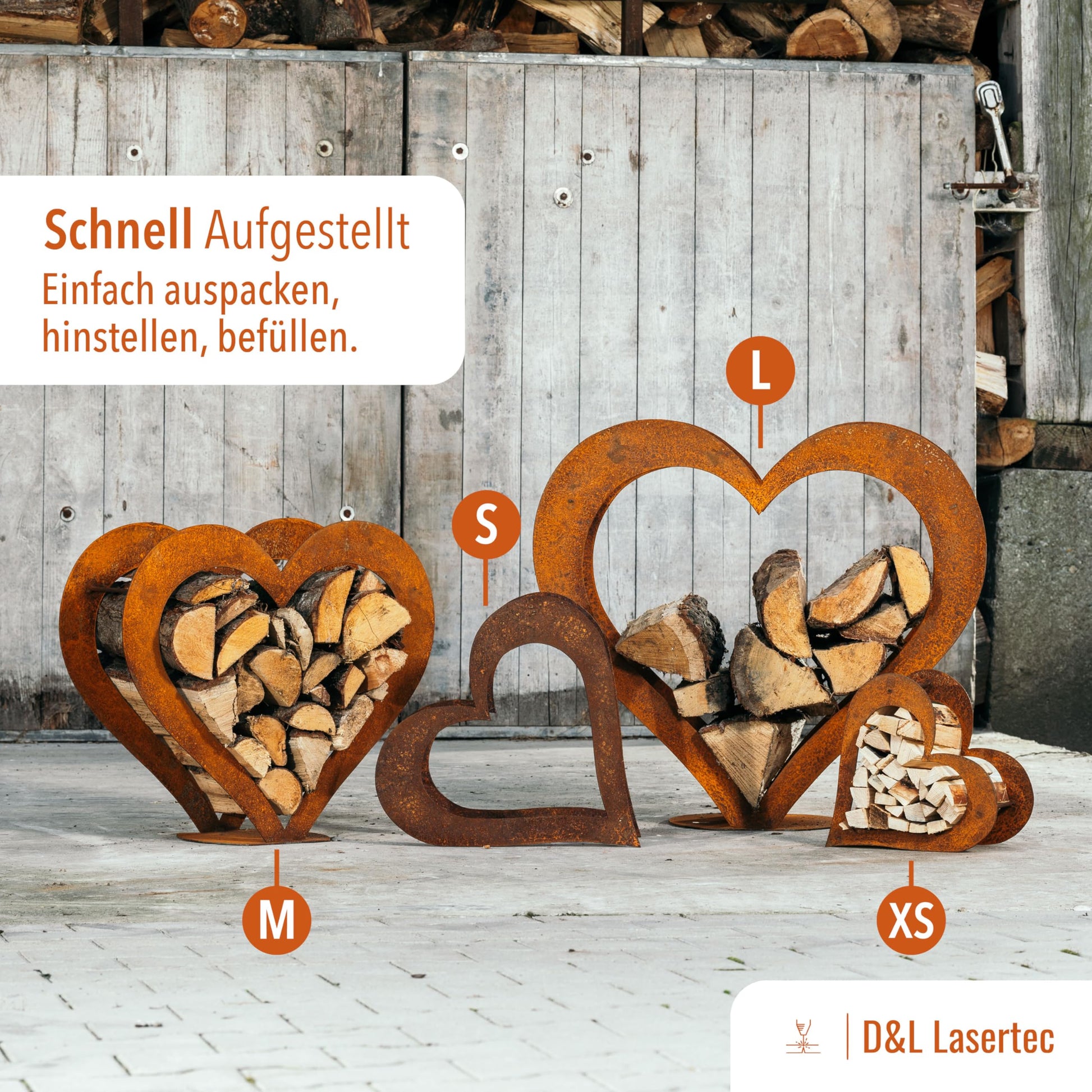 "TIMELESS DECORATION | These heart-shaped firewood racks are a great eye-catcher, whether in the garden, on the terrace, or on the balcony. Also ideal as a wedding gift, for example."