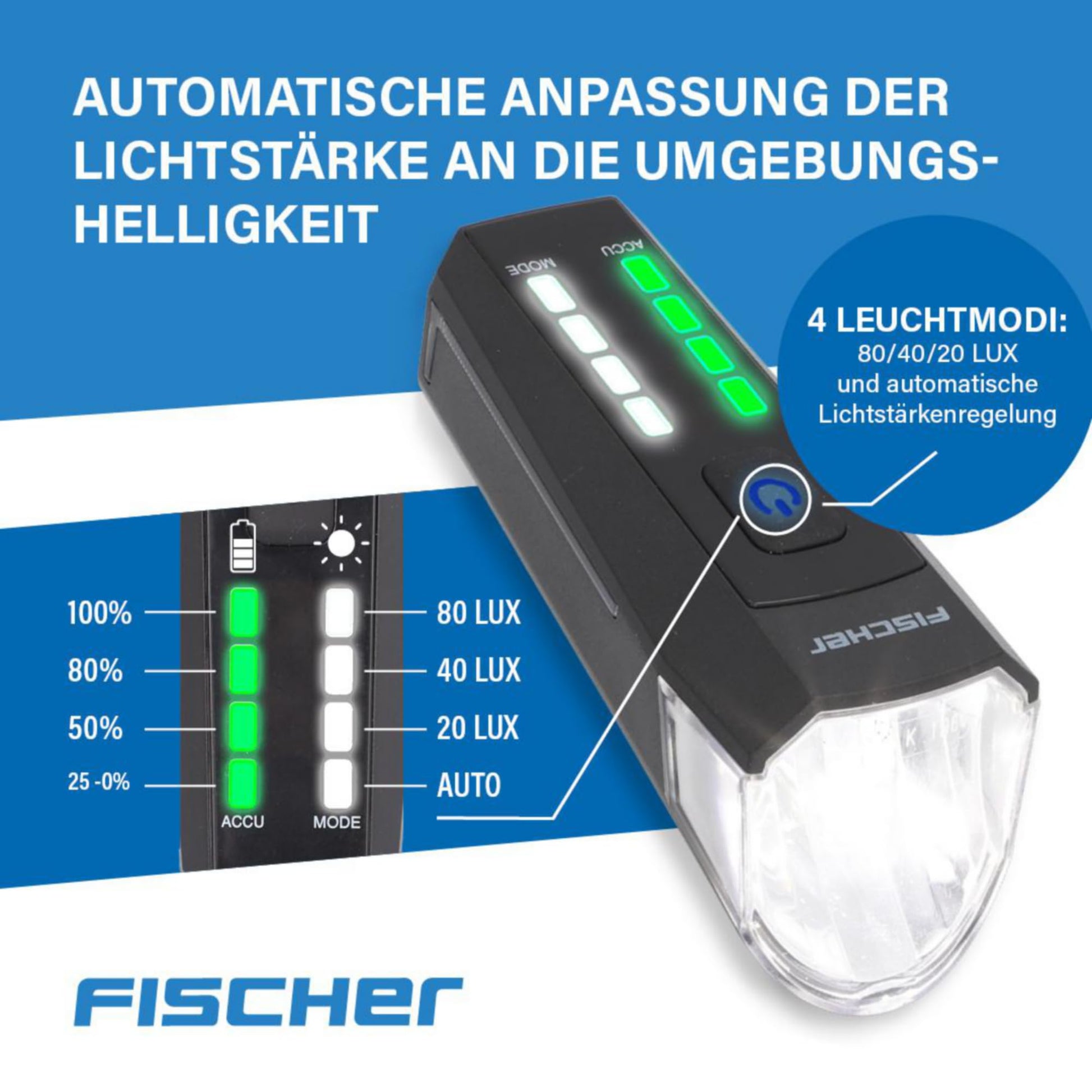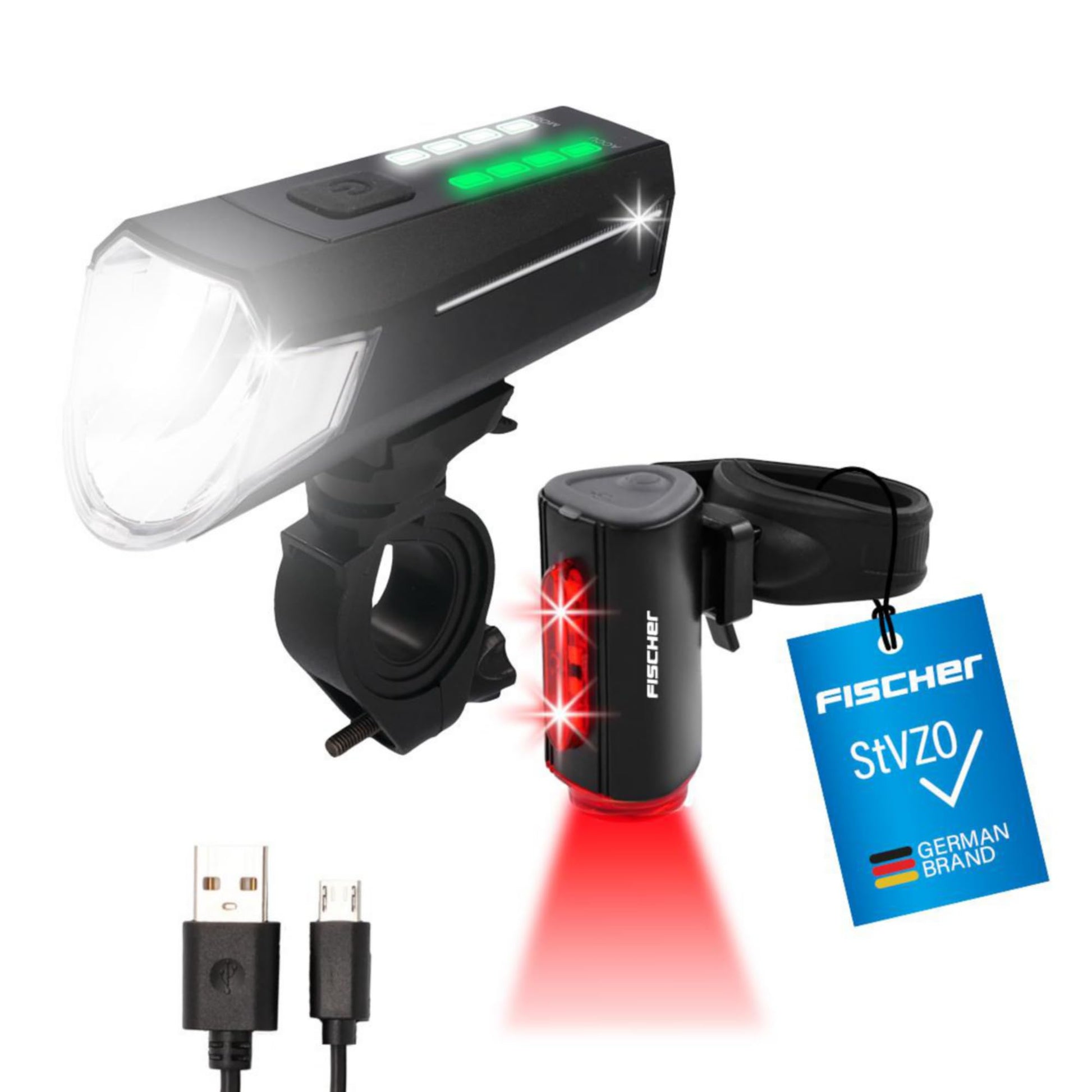 ["SAFE: With the FISCHER AKKU-Twin rear light in a set with the 80 Lux front light, you are excellently visible in darkness", "DURABLE: Thanks to the latest LED technology, up to three times longer battery life than conventional bulbs - up to 50,000 hours", "PRACTICAL: With quick attachment, you can attach and remove the LED front and rear lights at any time", "VISIBILITY: The additional Power-LED ground illumination shines for up to 240 minutes and projects a circle of light around the rear wheel", "CHARGE LEVEL: 4 LEDs indicate the current charge level of the front light and signal when the light needs to be recharged with the supplied micro-USB and USB-C cable", "APPROVED: The bicycle lighting set, unrestricted for road traffic, complies with the legal requirements of the StVZO"]