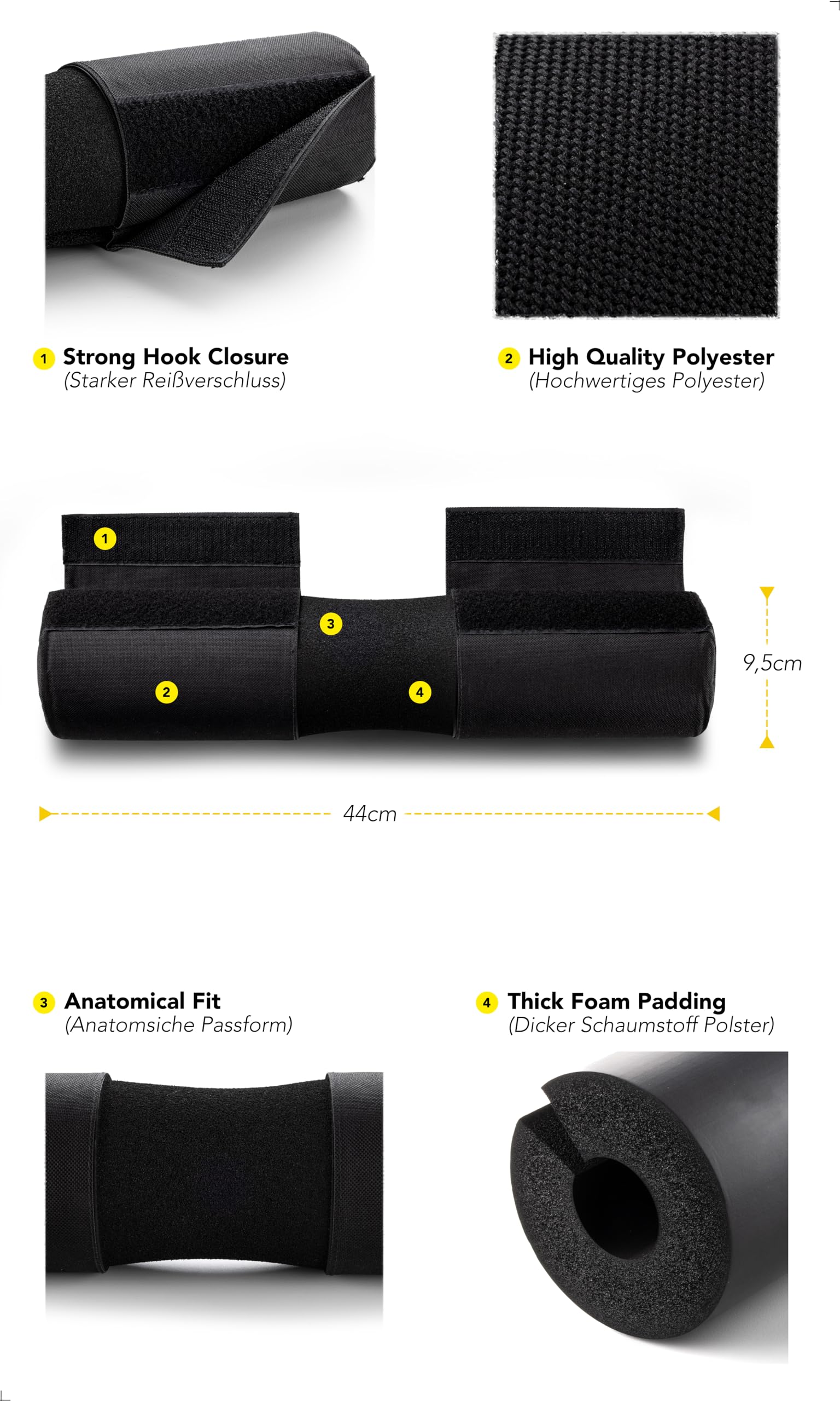 ["FOR MORE COMFORT - the barbell pad from FITGRIFF helps to avoid uncomfortable pressure points and pain during training. Due to the additional comfort, new personal bests can be achieved in the workout. A user manual is included in the packaging for correct use.","HIGH-DENSITY "EVA" FOAM - the special properties of this foam make the neck padding light and elastic, yet very strong and durable. Even with heavy training weights, the load is successfully cushioned.","PRACTICAL DESIGN - thanks to the fabric cover with velcro fastening, the pad can be attached to the bar quickly and easily. No annoying straps or other accessories are required.","FOR ALL STANDARD BARBELLS - the pad has a length of 44 cm and a diameter of 9.5cm. The inner diameter of approx. 3cm is suitable for all standard and Olympic barbells.","ESPECIALLY DURABLE - the EVA foam itself is indestructible. The cover is made of durable polyester. If any issues arise, simply send us a brief message and we will replace the item immediately"]