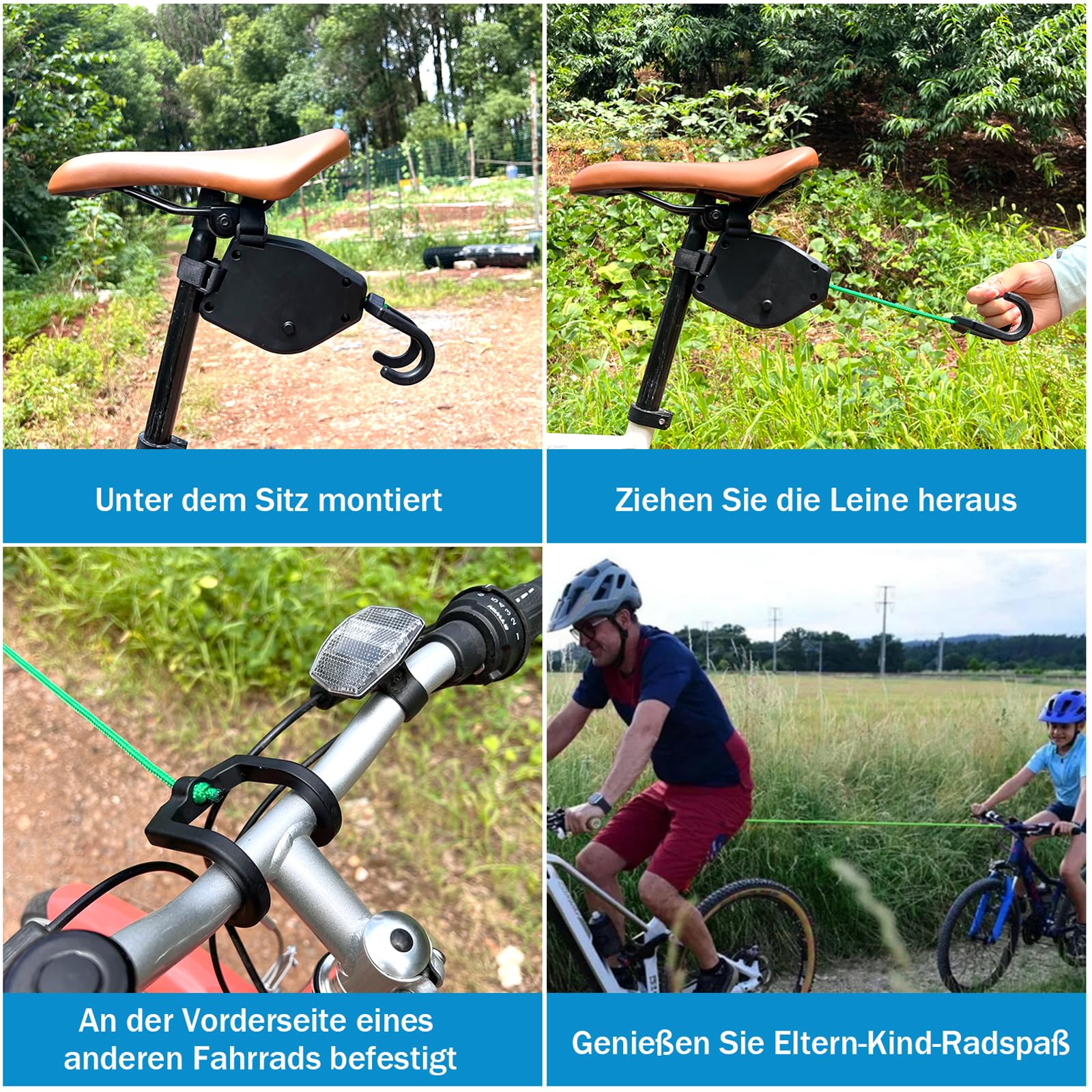 ["Retractable Bicycle Tow Rope This bike tow rope for kids allows you to tow your child on their bike while they can still control and balance their bike to handle any terrain and water on the road.","High-Quality and Durable This bike tow rope for kids uses high-quality nylon and elastic rope materials that are extremely strong and durable. It is shock-absorbing and elastic, effectively preventing the straps from keeping a safe distance from the wheels during the ride.","Easy to Use You just need to connect this bike tow rope with the saddle in front of the bike and the handlebar behind the bike, very simple.","Easy to Carry The elastic bike tow rope for kids is very light and compact, can be taken anywhere.","Ideal Choice This bike tow rope for kids becomes the perfect assistant for your family trip! It ensures your child's bike is securely parked on the slope. The elastic bike tow rope provides extra drive for children when riding and helps them reach their destination effortlessly."]
