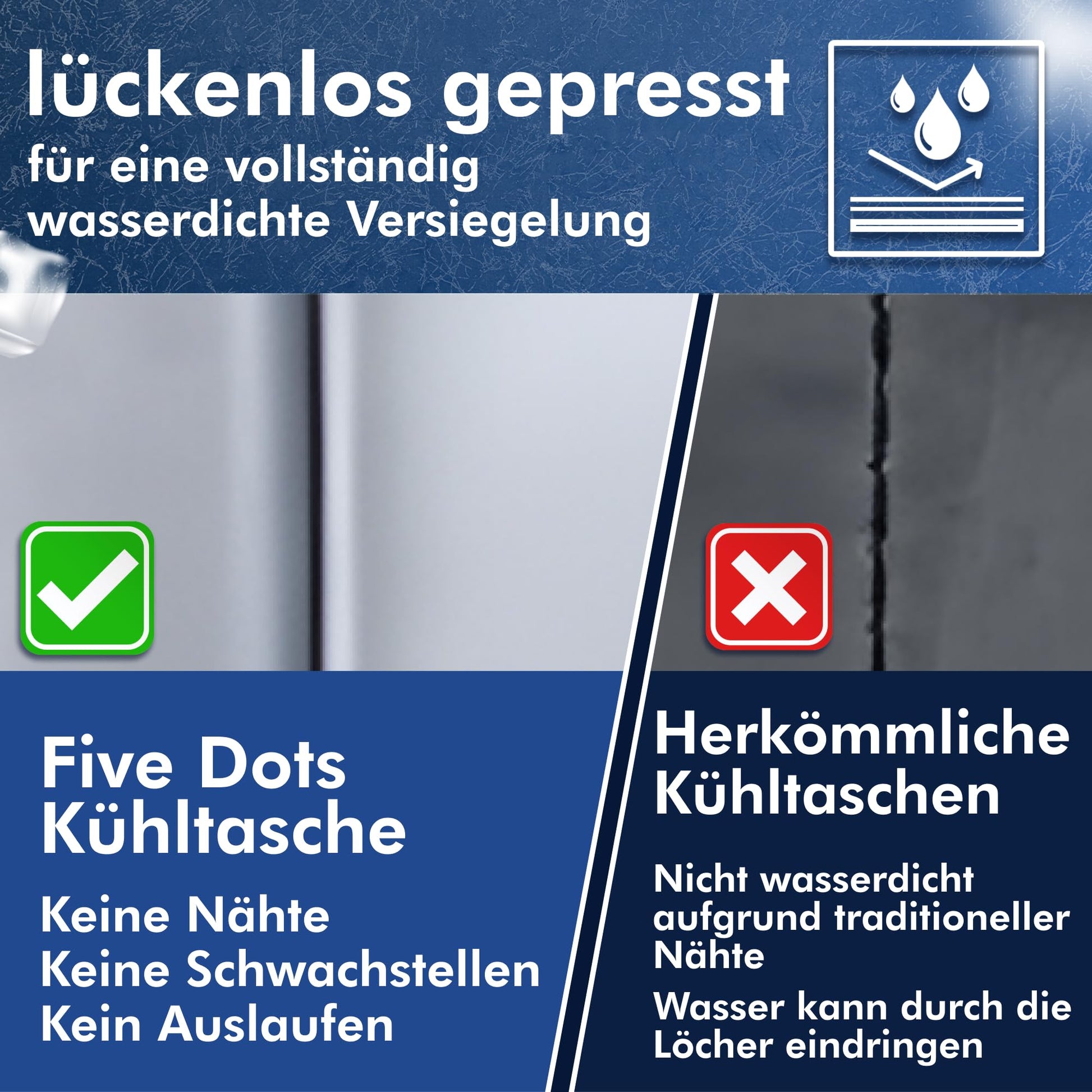 "FIVE DOTS VERSPRECHEN - Five Dots steht für Qualität - Hochwertige Kühltasche aus langlebigem 900D Polyester (wasserabweisend) & SBS Reißverschlüssen. Sei 1000+ Tage unterwegs mit Five Dots."