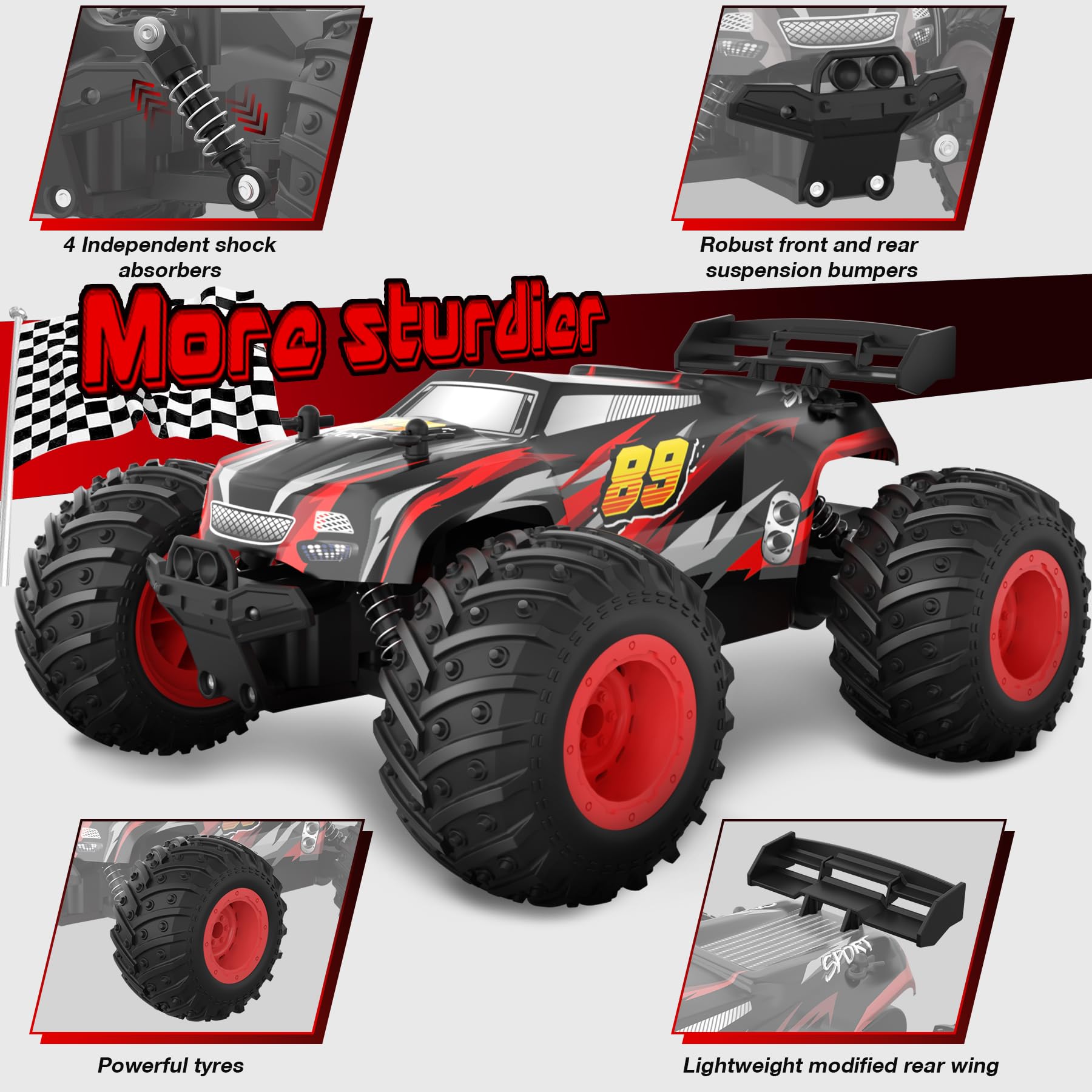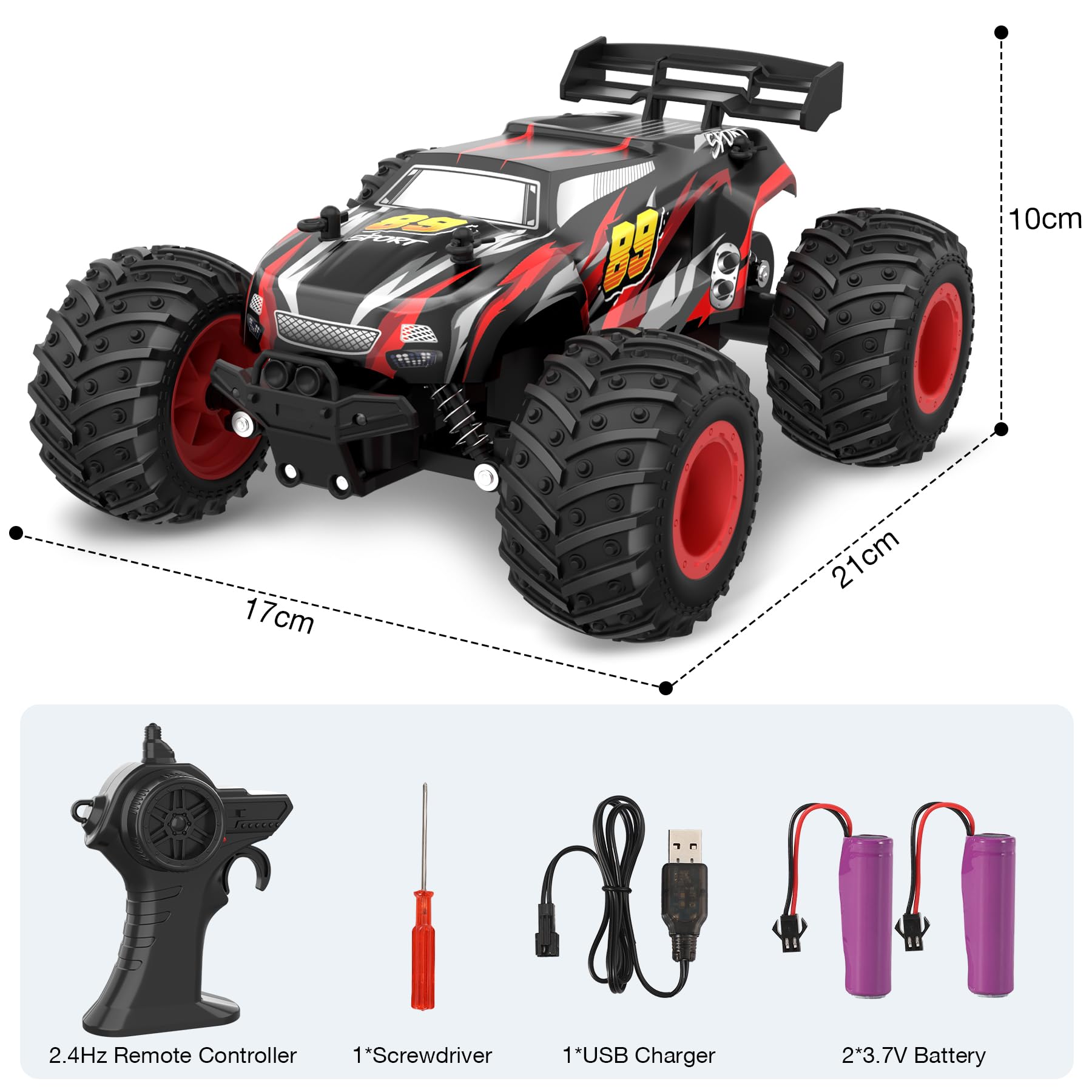 ["Powerful: With the remote control on the handle, you can drive forwards/backwards or left/right. This car uses 2.4GHz Bluetooth technology with a remote control range of up to 40 meters, avoiding signal interference between multiple remote-controlled cars and ensuring a stable and lag-free remote control connection.", "New Improved Semi-High-Speed Offroad Racing Car: This off-road car has a cool red body and is equipped with 4 enlarged anti-slip tires, suitable for children and adults. The high-quality tires are not only stable in operation, but also adaptable to various surfaces, allowing for easy control on grass, sand, water, snow, gravel roads, as well as carpets, stairs, and indoor floors.", "Two Batteries and USB Charging: The off-road car comes with two original batteries with a capacity of 500mAh each. With each fully charged battery, children can play for almost 20 minutes. The USB charger for the batteries is easy to use and features multiple functions such as overcharge protection and short circuit protection.", "Reinforced Body and Waterproof: The remote-controlled car has good collision resistance, with the entire chassis made of ABS plastic and the main body made of aluminum alloy. At the same time, this car is waterproof and can easily drive through puddles.", "Ideal Gift Choice: This remote-controlled car is not only an excellent toy, but also a perfect gift for boys and girls aged 3, 4, 5, 6, 7, 8, 9, 10, 11, and 12 years old. Its innovative design, powerful operation, and durable quality make it an ideal gift for birthdays, parties, and various holidays (Easter, Christmas, Halloween, Thanksgiving)."]