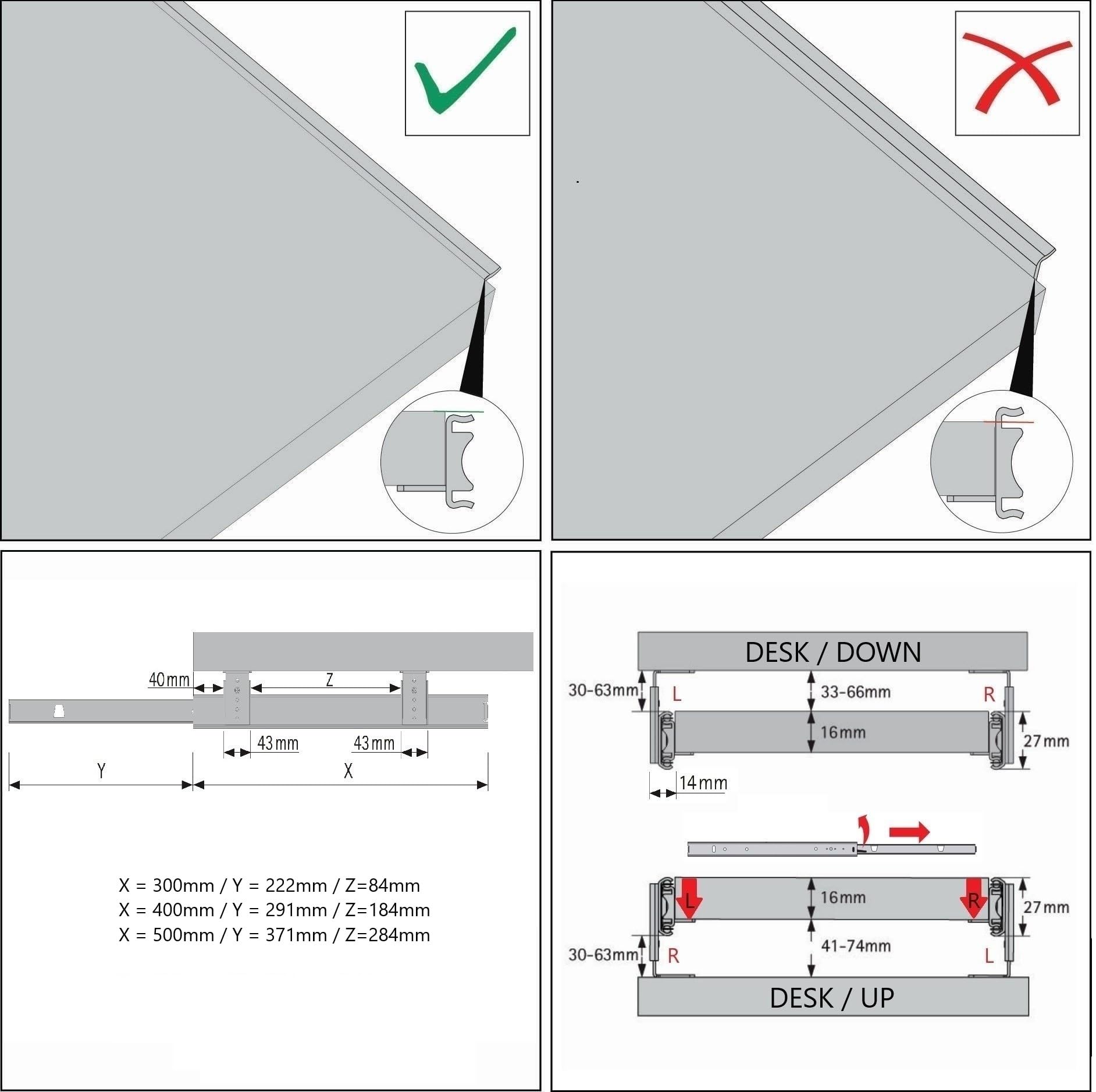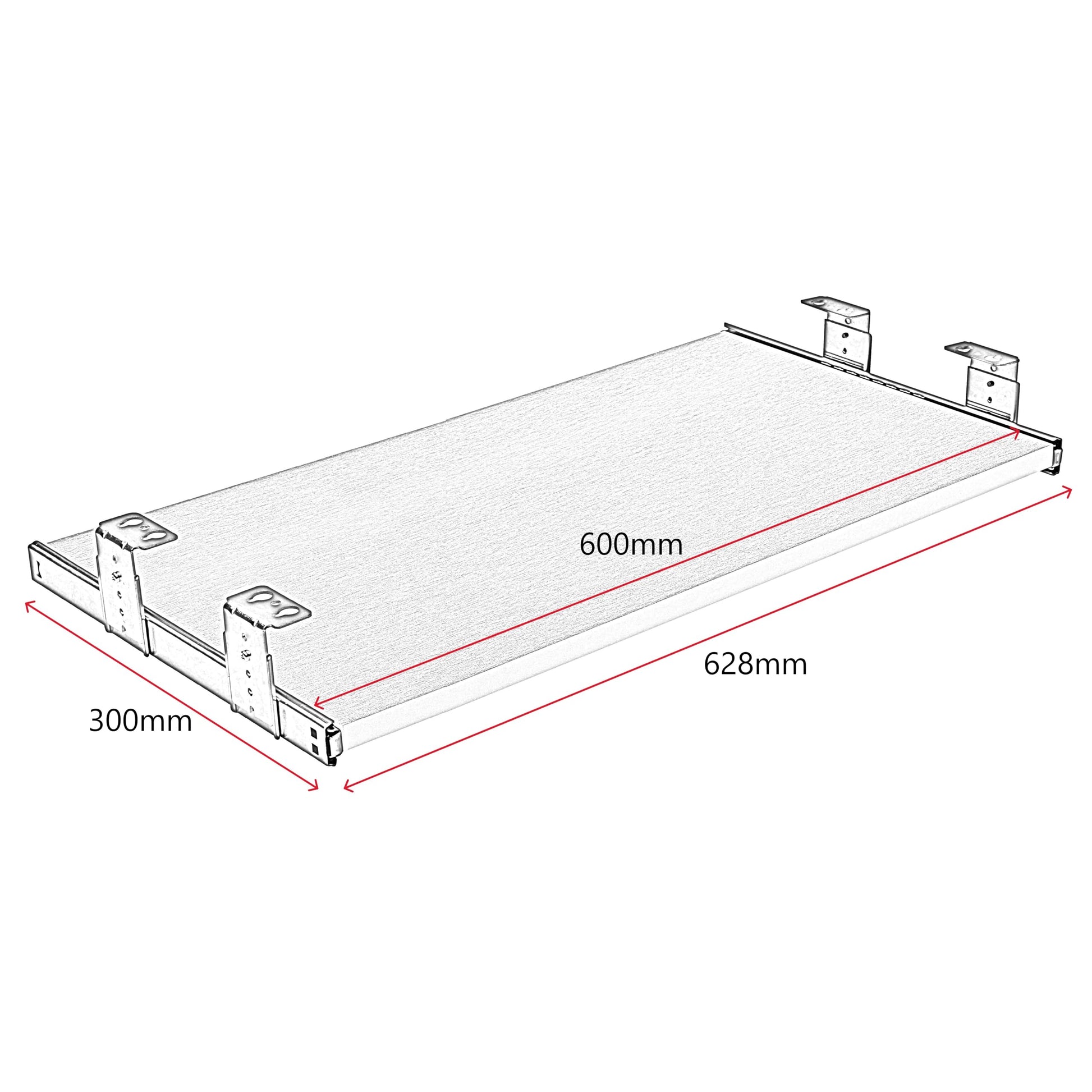 ["Ball-bearing precision slides with locking mechanism for mounting on and under the table for keyboard and mouse, perfect telescopic extension for retrofitting desks and PC tables, drawer extendable to 222mm","Ball bearing slides automatically stop and lock at both endpoints (extended+retracted), 628mm total width including extensions provide enough space for keyboard and mouse pad in the office and home office","Very easy installation of telescopic extension rails and shelf brackets, smooth and maintenance-free rails, usable height adjustable from 33-66mm, extensions loadable up to 20kg","Customizable shelf width through custom-made with item number B0CZ7DJD1D available. Panel available in colors: white, black, sonoma oak, beech, silver aluminum, maple, solid beech wood, solid spruce pine also with galvanized extension rails through item number B08RCWN84S and as a clamp extension for screwless installation through item number B093DXVMK5. Please enter the respective item number in the search field if needed.","Scope of delivery drawer extension: shelf in black matt color including keyboard rails, detailed assembly instructions, mounting screws"]