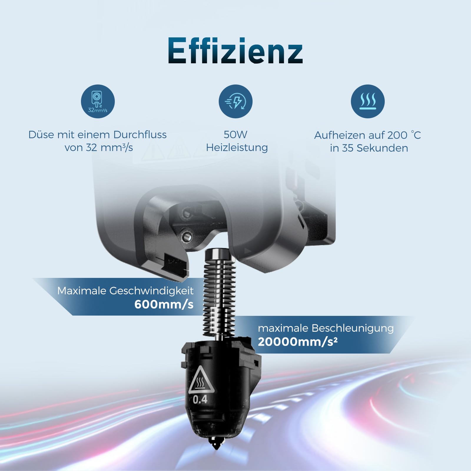 "High-performance Extrusion with 32 mm³/s flow rate. Fastest filament flow in the segment - The 50W Turbo heater cartridge reaches 200°C in 35 seconds, supported by high-temperature printing nozzles (0.25-0.8 mm). Up to 70% shorter printing times compared to standard printers.",