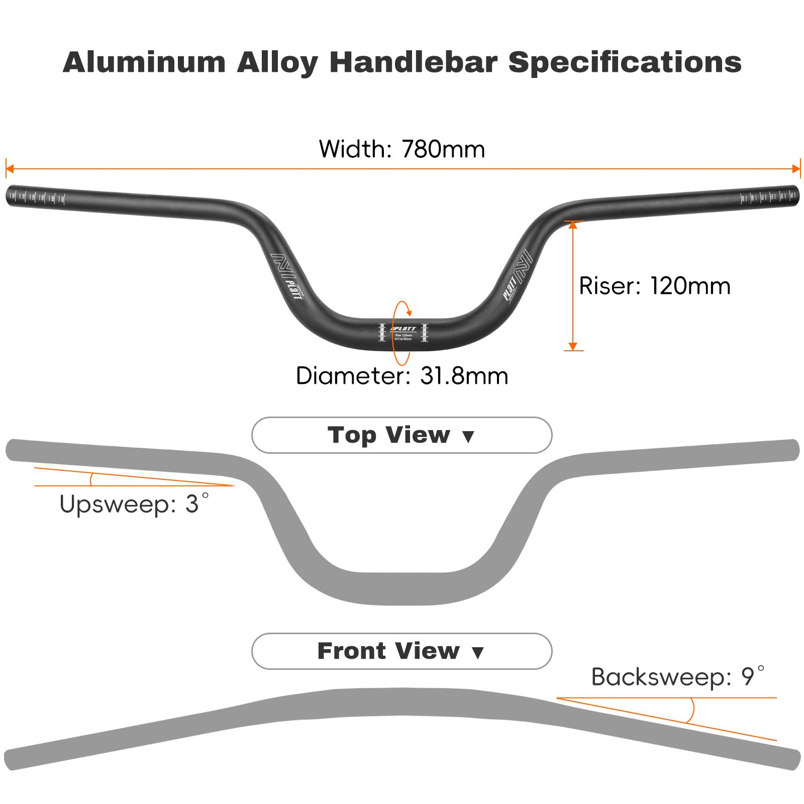 FLAT bicycle handlebar 25.4/31.8 * 620/780, mountain bike riser handlebar made of lightweight aluminum alloy, ideal for MTB (31.8mm-780mm, 120mm Rise)