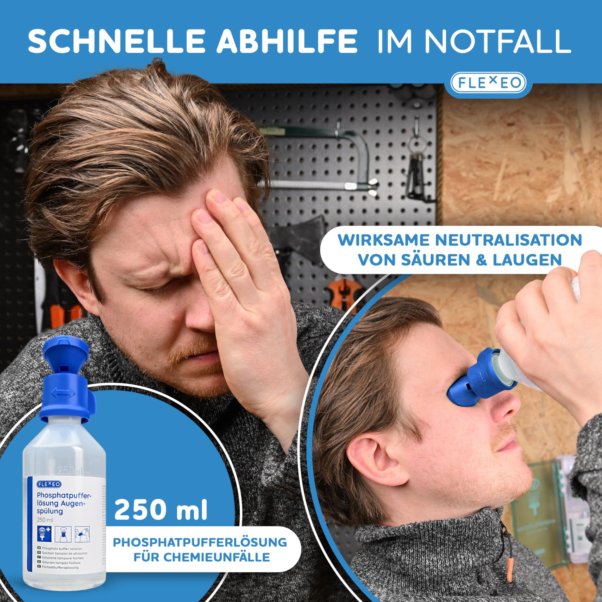 FLEXEO Eye wash station incl. (1x 500 ml NaCl saline solution + 1x 250 ml phosphate buffer solution) with wall mount – eye flushing – eye shower – sterile NaCl eye wash solution – pH-neutral