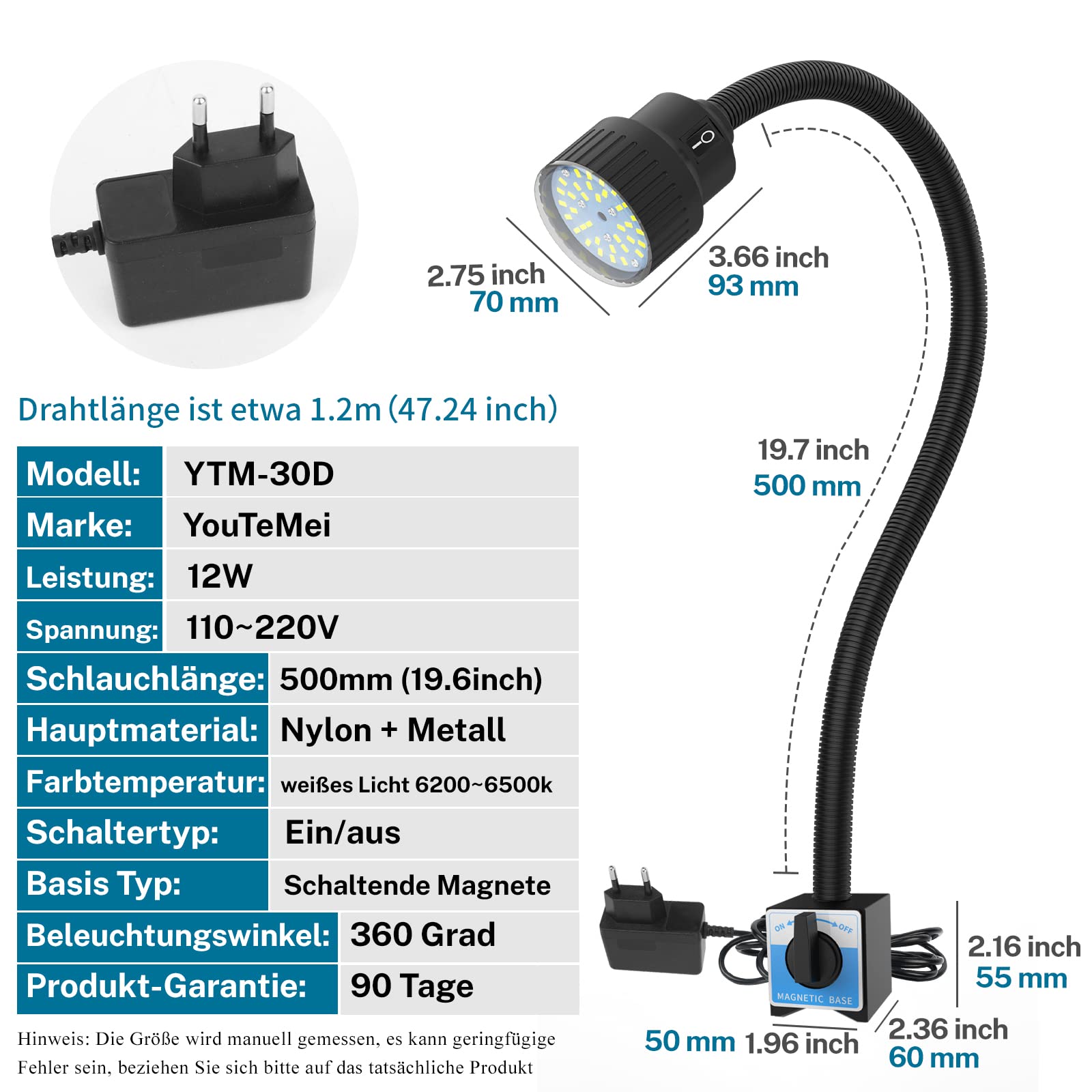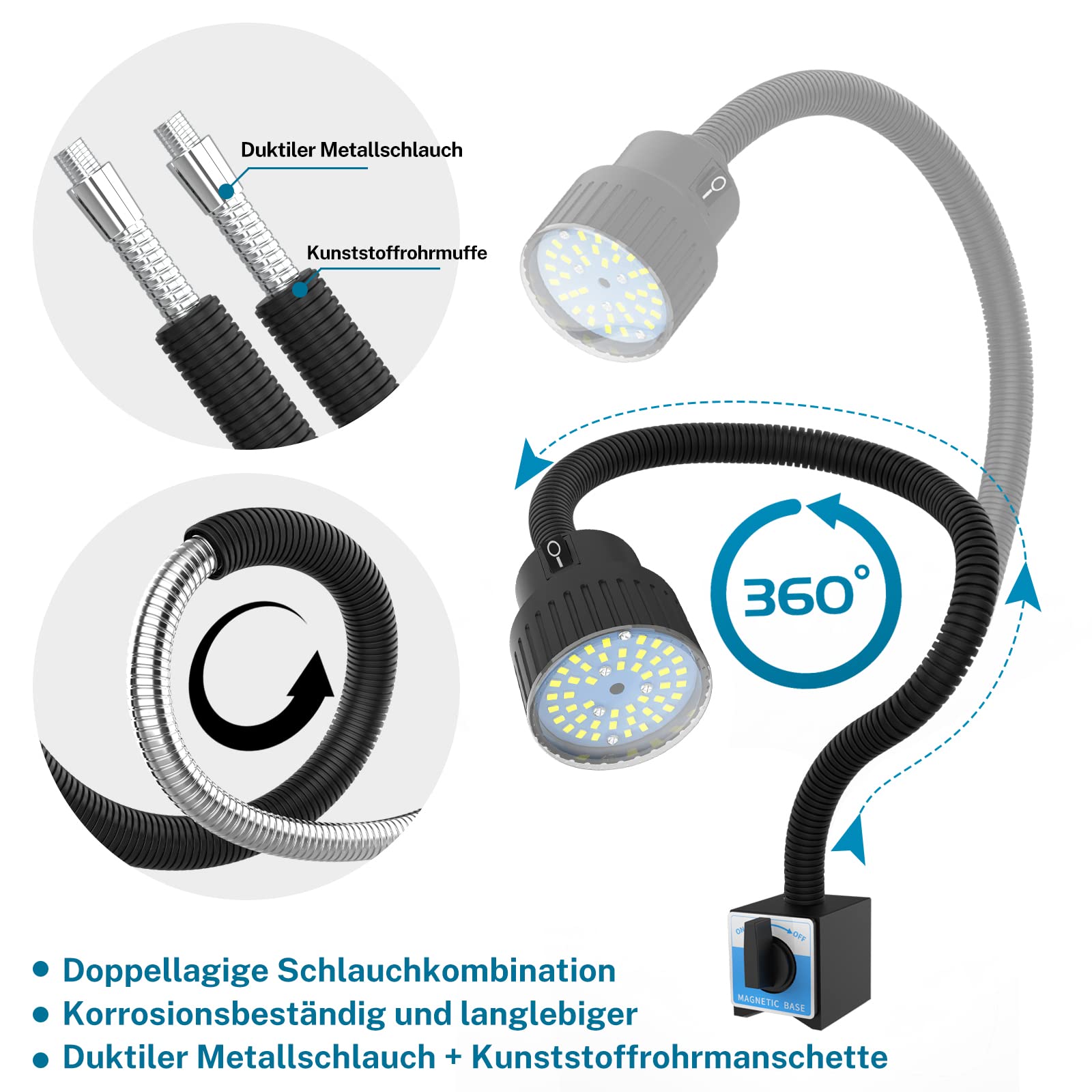 ["High-quality LED lamp: The lamp contains 46 LED lamp beads. The luminous flux is approximately 1200 lumens, which provides higher light output and brightness than halogen lamps, as well as lower energy consumption. 【Aluminum lamp holder: The lamp cover made of aluminum alloy ensures excellent heat dissipation, rust resistance, wear resistance, and impact resistance of the work lamp. The lamp holder includes convenient button switches. 【Two-layer flexible gooseneck: The hose is made of two layers of outer plastic and inner metal. It is corrosion and oxidation resistant and is approximately 20 inches long. 【Magnetic base with super adhesion: The heavy-duty magnetic base instantly adheres to machines, workbenches, or vehicle parts – simply position and you're done! Saves time on assembly and transport. 【Quality assurance: We support refunds or exchanges for quality issues within 365 days. We take full responsibility for product and customer satisfaction. If our lamps have quality issues or you are not satisfied with your purchase, please contact us and we are always ready to help."]