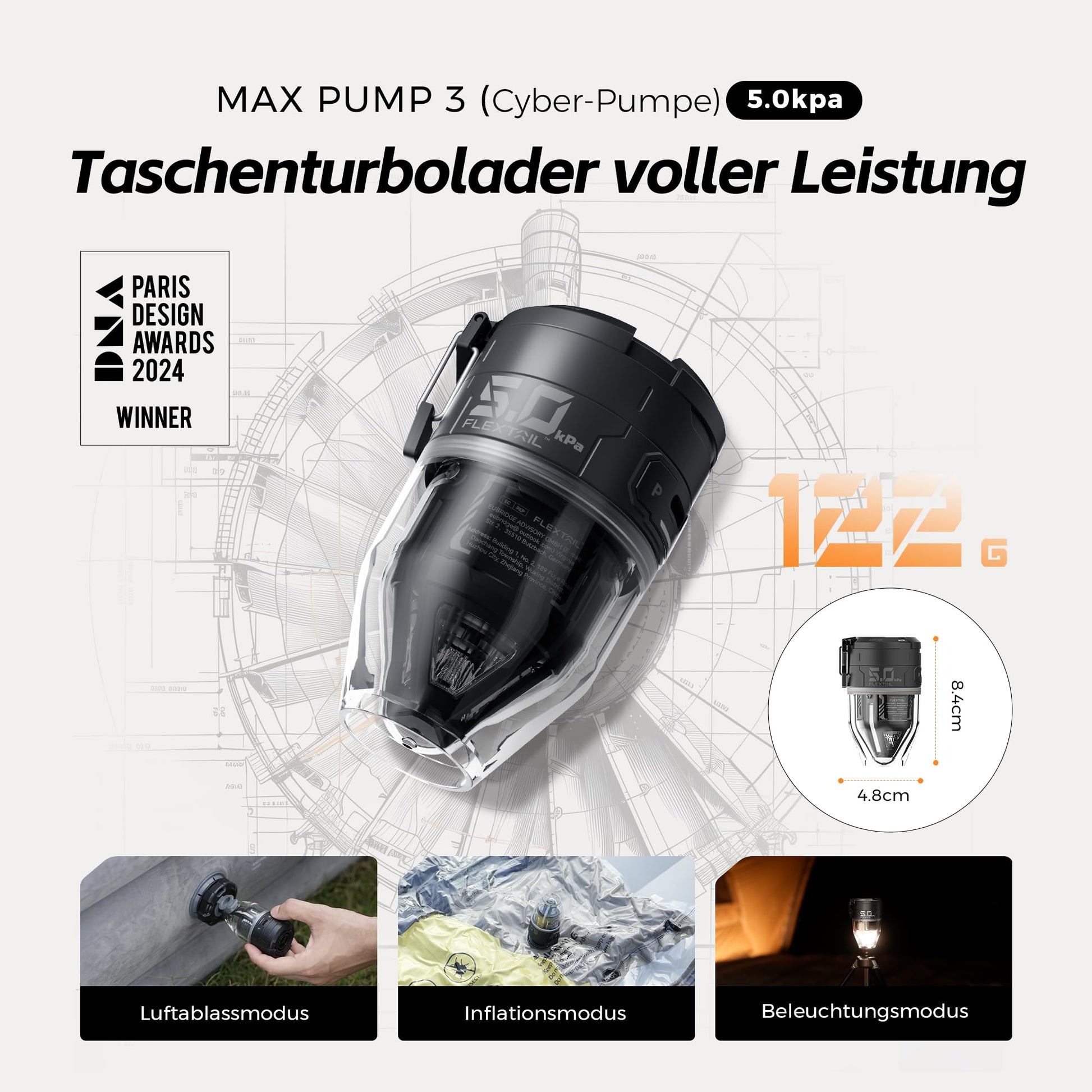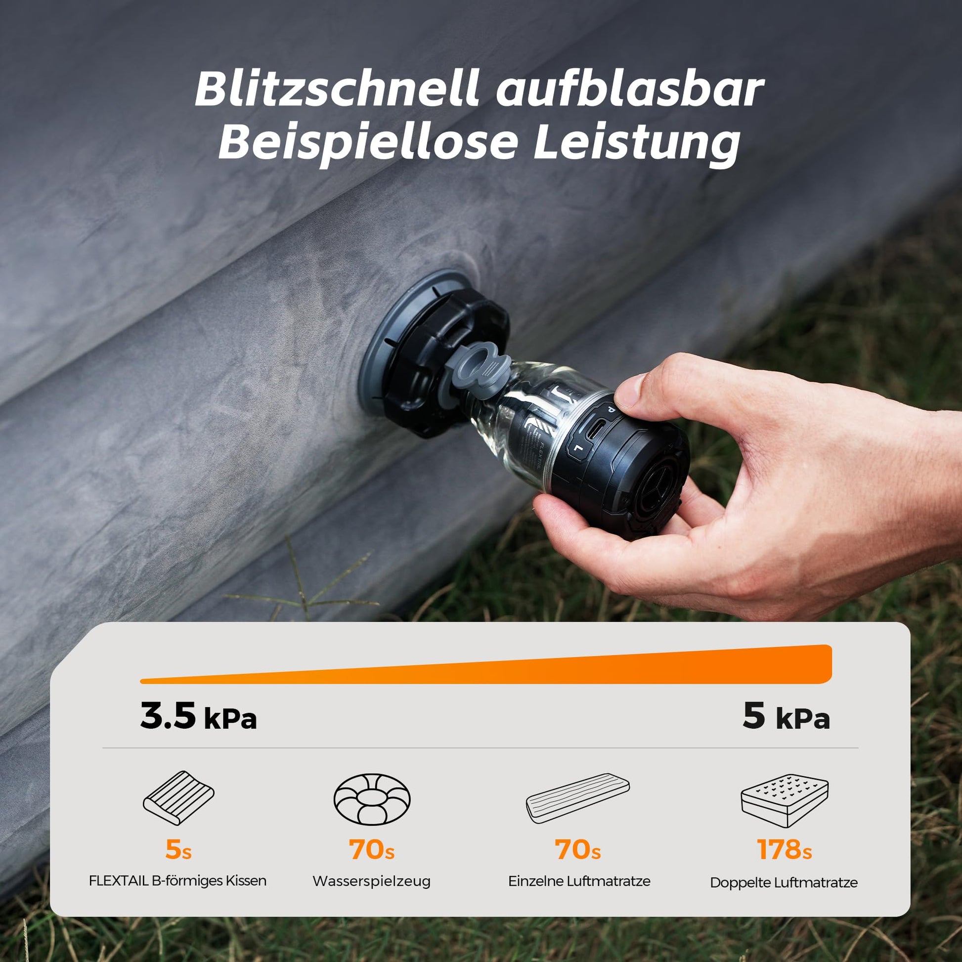 ["【Compact Manual Air Pump】 The electric air pump MAX PUMP 3 weighs only 122 grams, making storage and transportation very convenient. It is so small that it can be activated with the push of a button and fits in the palm of your hand, making it easy even for a child to operate.",