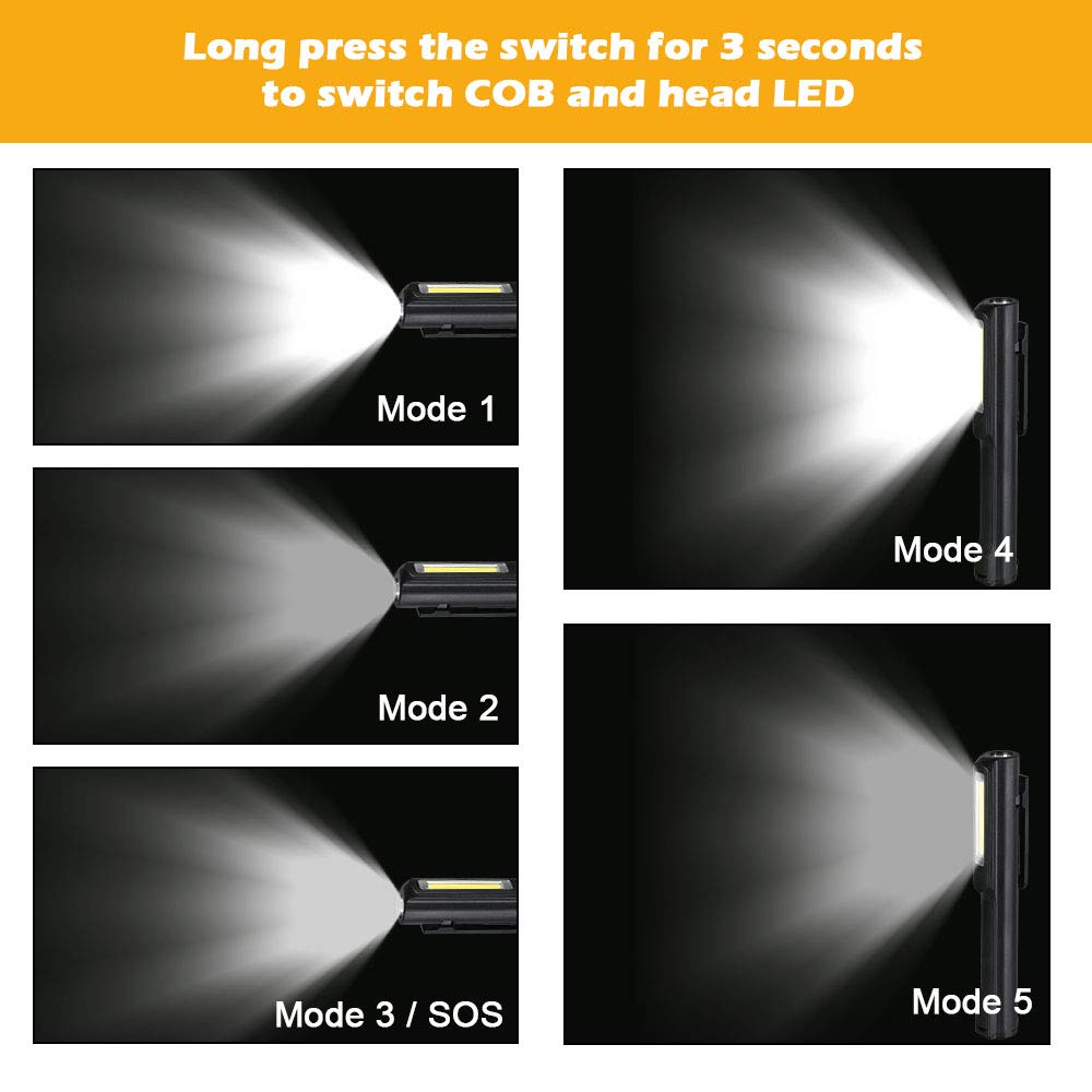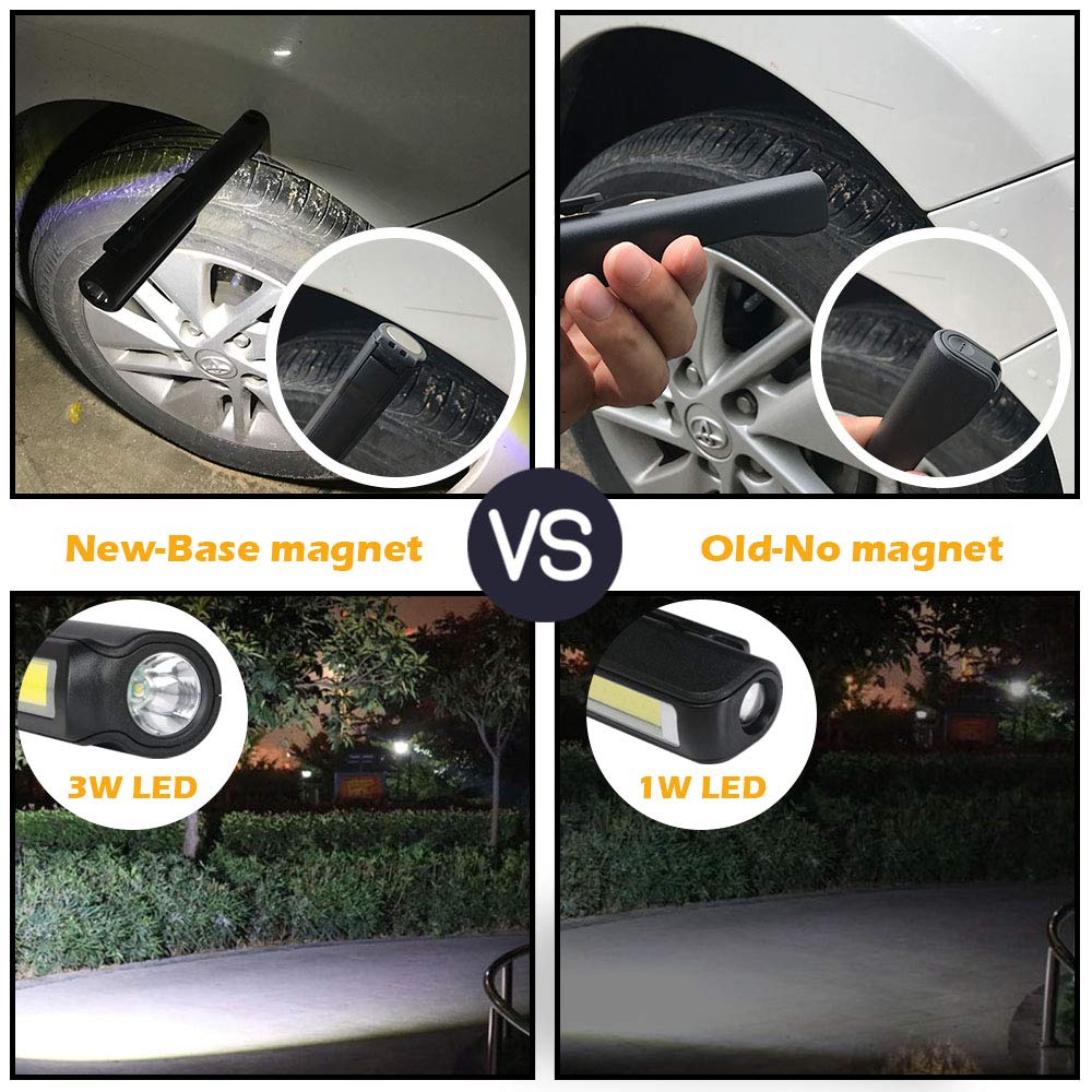 ["🌟【2 in 1 Work Lantern】: 3W COB lantern on the side of the lamp to cast a beam of light of 350 lumens. Super brightness, very high brightness and built-in 1200 mAh 2 * 14500 Li-Ion batteries, this LED work light can work continuously for up to 4 hours.","🌟【Magnetic Adjustable Clip】: The flashlight is equipped with a magnet that can be rotated 120 degrees thanks to this design. It can be attached to iron and stays securely in place, perfect for work, the LEDs provide a lot of light and the magnet allows you to work with both hands free and adjust the desired angle.","🌟【Easy to Use】: Rechargeable work lamp Both lights are cycled through a single small rubber button. The lamp has its own internal battery, which is rechargeable through a micro USB port on the bottom. (We provide a micro USB cable and two rechargeable lithium batteries).","🌟【Robust and comfortable】: Excellent materials, the light is very powerful and can be placed anywhere thanks to the magnet. The magnetic clip for attaching to a bag, belt, pocket, or book, and strong magnets can hold the work light on the iron metal surface, such as a car, truck, machine, when working or repairing.","🌟【Practical】: This work lamp is very practical. Great for home, outdoors, car, camping, hunting, fishing, dog walking, and emergency light use, providing enough light to illuminate the work area even in an emergency. It can be useful when changing a tire or when hanging in the engine compartment when doing mechanical or DIY work. A good versatile product in its operation for intervening in the car's engine compartment and for all those situations where a strong light is needed."]