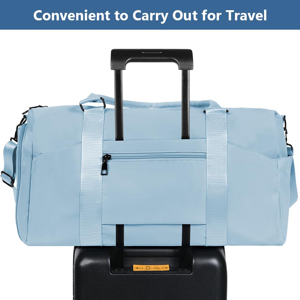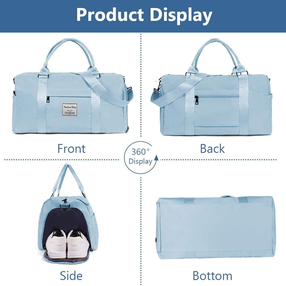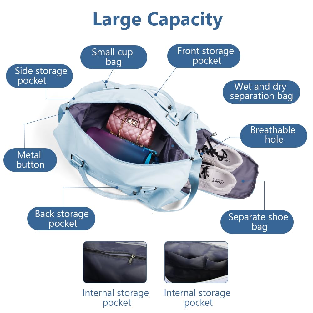 "🛫Versatile: This travel bag easily accommodates all your fitness or travel essentials. The adjustable and detachable shoulder strap of this beach bag reduces the strain of carrying and improves comfort. It can be carried by hand, on the shoulder, or in a suitcase for various purposes. It is the perfect reliable companion for the gym, sports, travel, weekends, luggage, shopping, hiking, and camping."]
