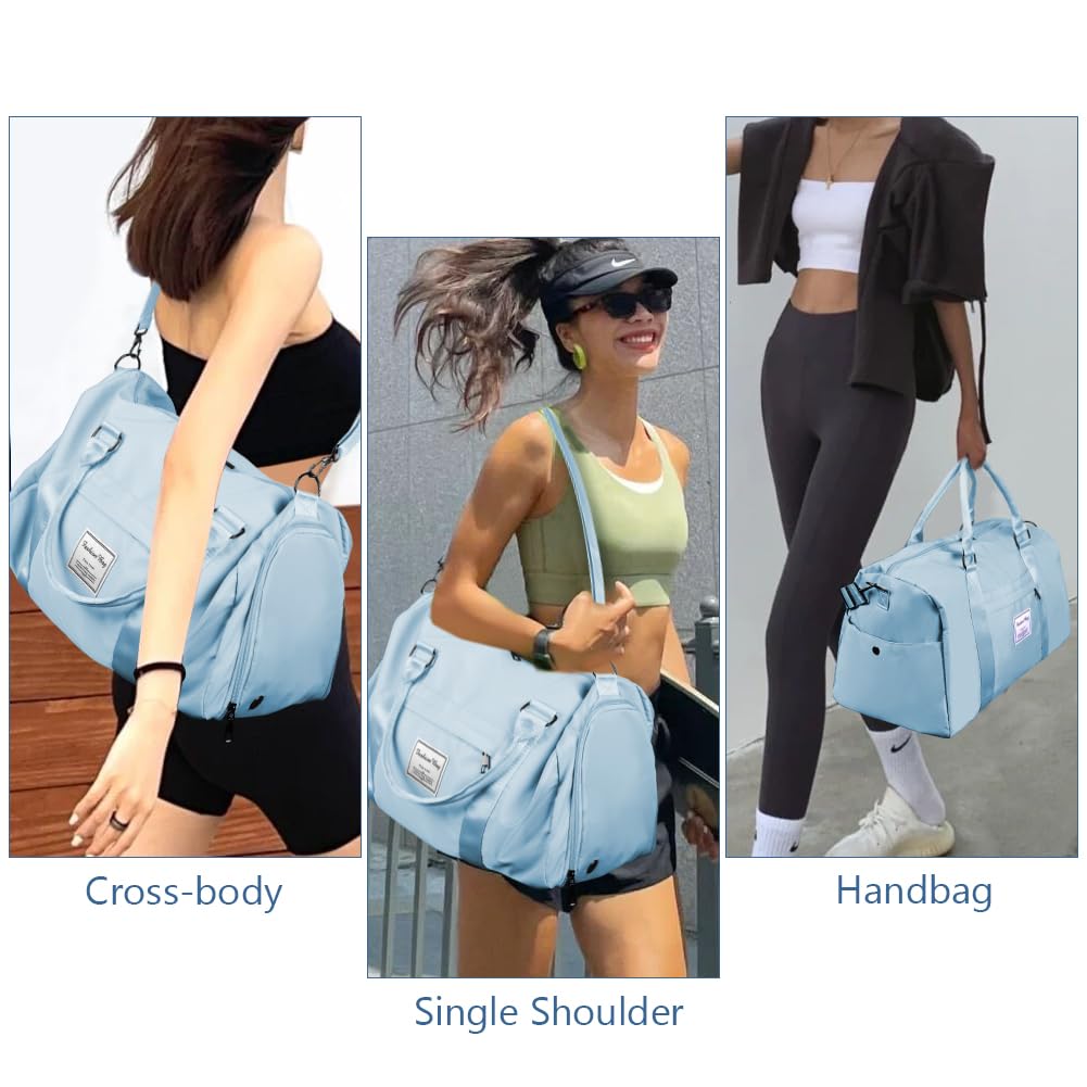 "🏄♂️Wet and Dry Compartment: This sports bag features a spacious main compartment and a zippered wet compartment to separate your dry cleaning items from toiletries as well as wet and dirty clothes. In addition to this women's sports bag, we also provide you with a small storage bag where you can store chargers, cosmetics, wallets, keys, headphones, and other small items.",