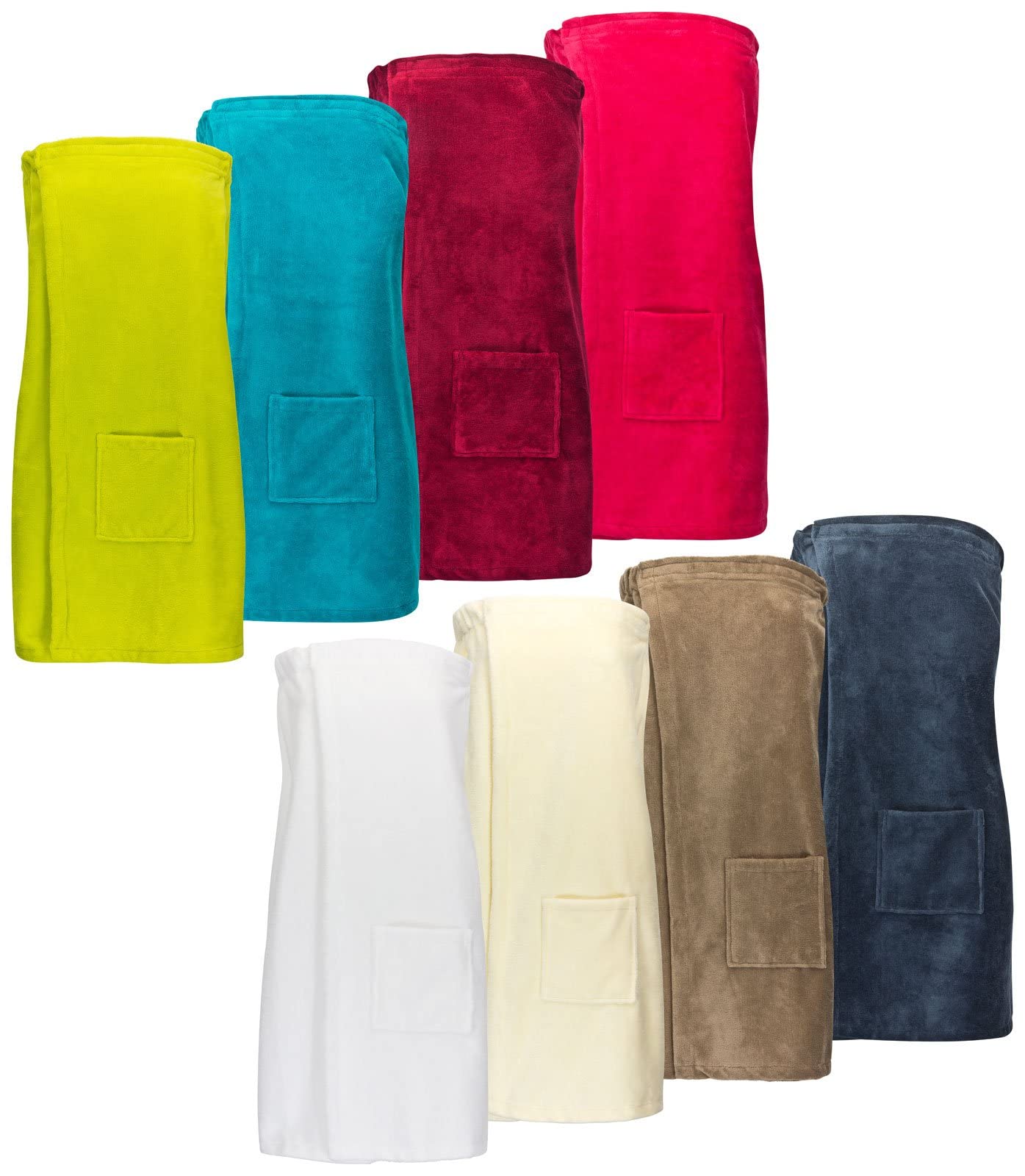 The sauna kilt is available for women in a length of approximately 31.5 inches and for men in a length of approximately 21.7 inches in various colors. The elastic band makes the kilts adjustable with a circumference of 27.6 to 55.1 inches.