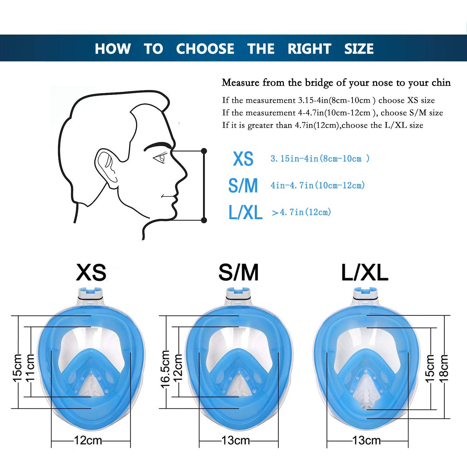 ["Anti-Fog Dive Mask - Design with separate breathing chamber to prevent mask fogging with dual airflow system, Enjoy crystal clear view of the experience.", "180° Panorama - The full face dive mask provides you with a shatterproof safety window with 180° wide view underwater.", "Full Face - The snorkel mask takes away the inconvenience of holding the snorkel in your mouth, allowing you to naturally breathe through your nose and mouth underwater.","Sports Camera Compatible - Full face dive mask compatible with sports cameras, allowing you to capture all the amazing things you see while snorkeling. (camera not included)", "More Comfort - Easy to put on, Panoramic full face snorkel mask with adjustable mask strap buckles and a soft, high-quality silicone rubber skirt provide more comfort while diving."]