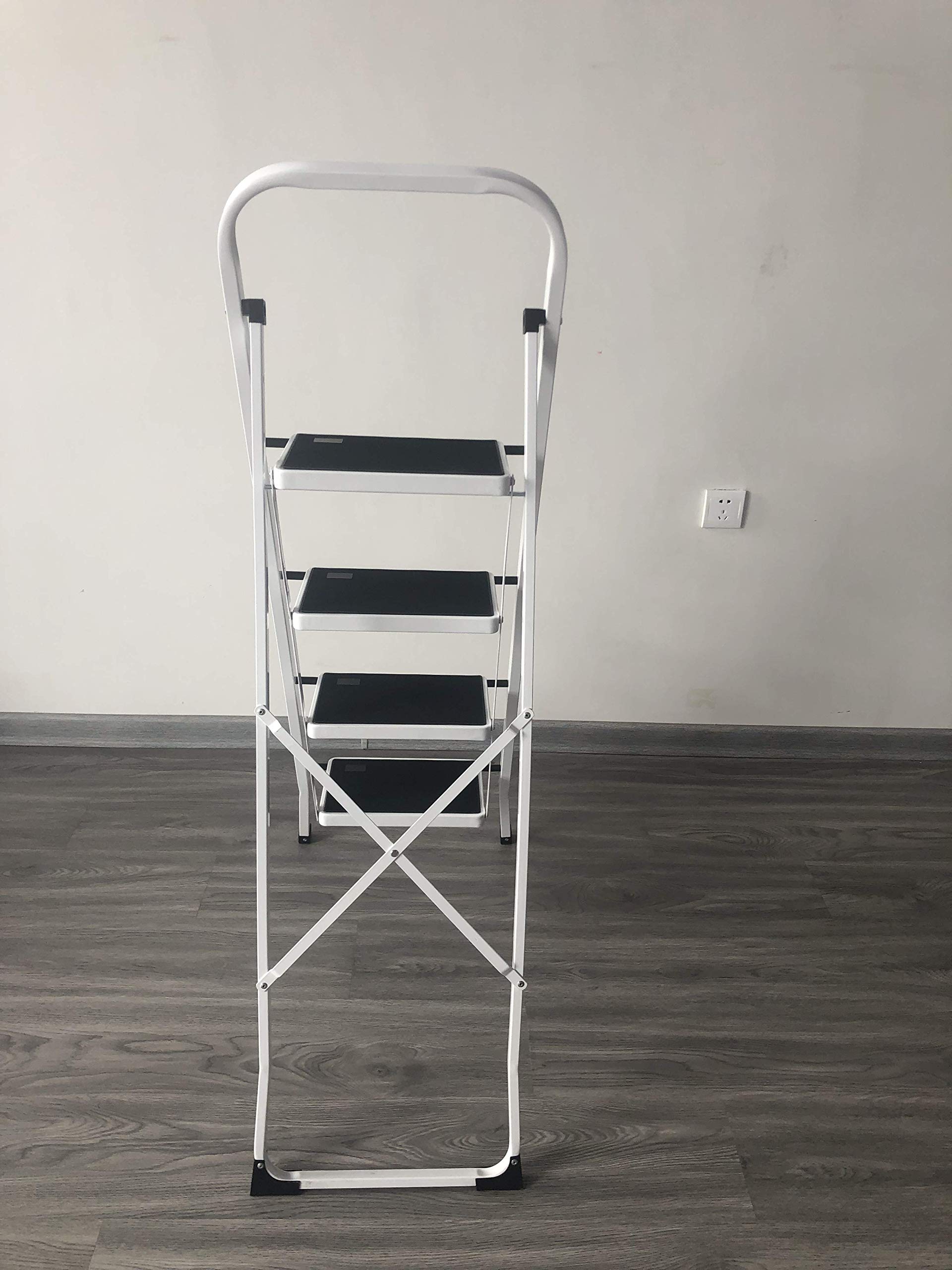"The step ladder is extremely robust and durable. It is long-lasting and can be folded up for easy storage. 4-step step ladder with non-slip mat, wide steps and rubber mats to prevent slipping. Strong and stable automatic safety metal lock, easy and safe to operate. This ladder is perfect for cleaning when trying to reach difficult areas, and ideal for painting and decorating as well as other DIY tasks. Suitable for attic, library, warehouse, supermarket, above-ground pool, bunk bed, trampoline, handcraft, house/building maintenance, window cleaning, car wash, outdoor/indoor decoration, painting and more tasks that require height."