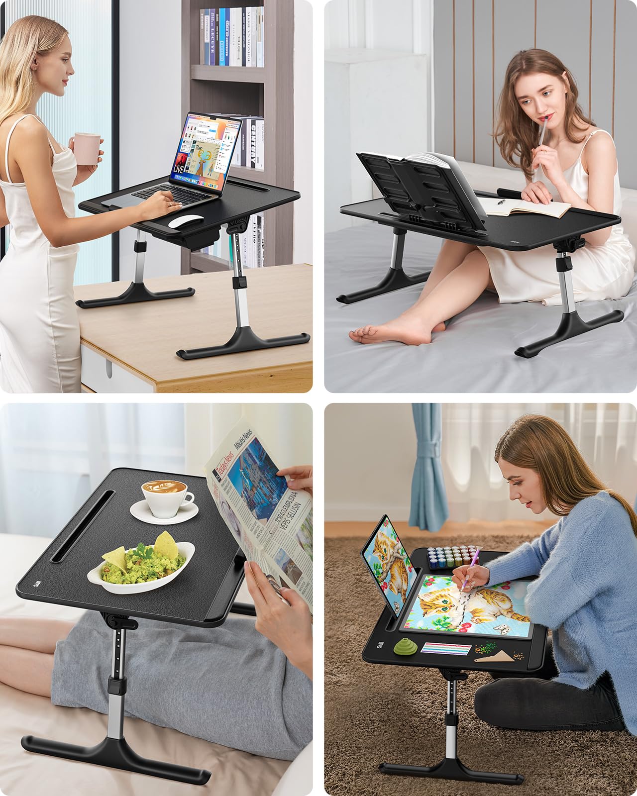 Folding Bed Table, SAIJI 60 * 40cm Laptop Desk, Adjustable Height in 5 Levels, with Book Stand, Drawer, Lap Stopper, Tablet Slot, Notebook Table for Reading or Breakfast and Drawing Table.