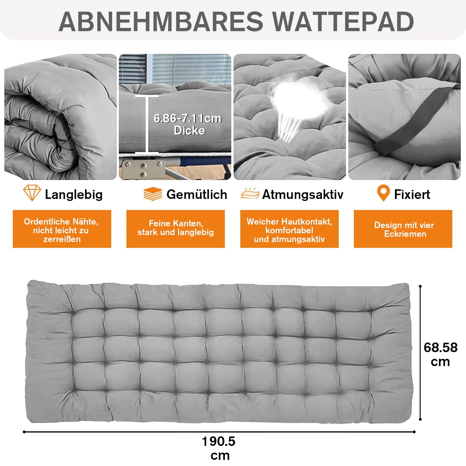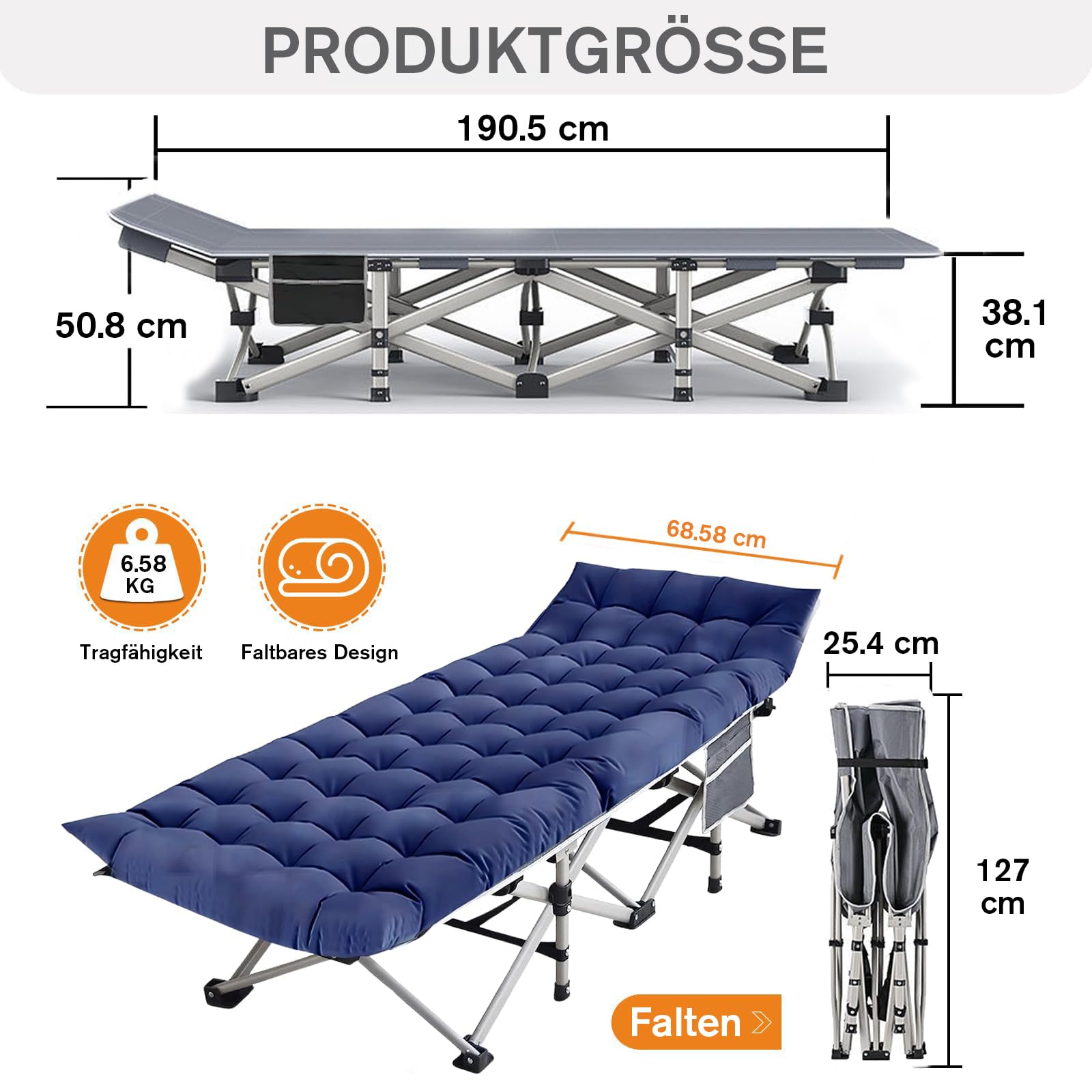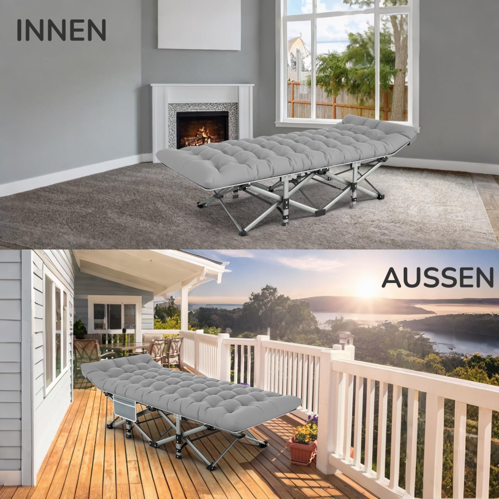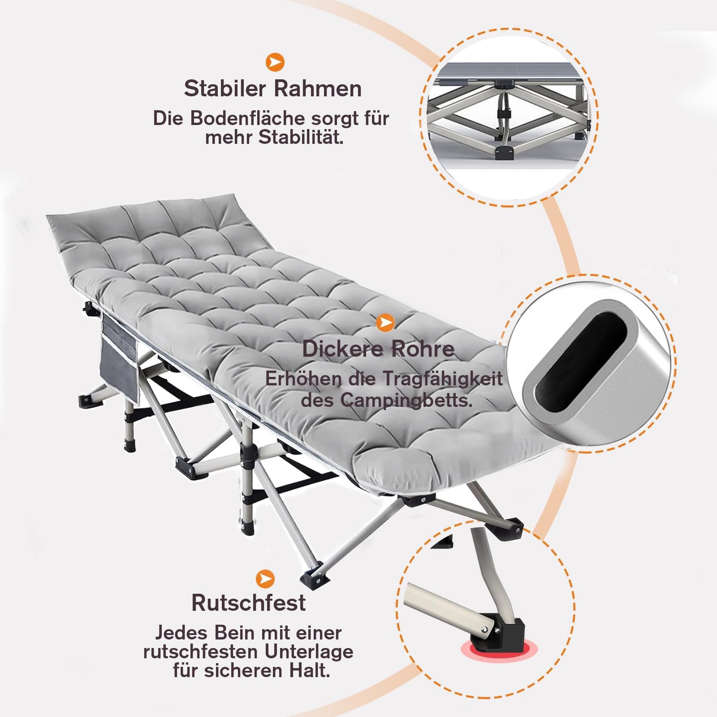 ["PREMIUM CAMPING BED (2 pack): Our upgraded camping beds are made of double-layered 1200D Oxford fabric, providing exceptional durability, water resistance, and easy cleaning. Each bed is supported by 10 sturdy steel legs and 25mm thick, flat square tubes, offering excellent stability and can support up to 800 lbs – enough for heavy adults.","SPACIOUS SIZE & EASY STORAGE: Enjoy extra sleeping comfort with dimensions of 190x71x36 cm when unfolded. Each bed comes with a convenient side pocket to keep essentials like snacks and phones within reach.","REMOVABLE MATTRESS PAD: Enhance your comfort with high-quality, ergonomic mattress pads that provide optimal neck and back support. The soft, removable pads add extra warmth and comfort, enhancing your camping experience.","ERGONOMIC COMFORT: The headrests feature an 18° incline that adapts to the natural curve of your body, providing excellent support for the cervical spine. The wide sleeping area allows for comfortable movement during sleep and ensures refreshing rest.","EASY TO SET UP AND CARRY: No assembly required. The adult sleeping beds can be set up in 10 seconds or folded into the included storage bags. If any issues arise, our customer service team is always available."]