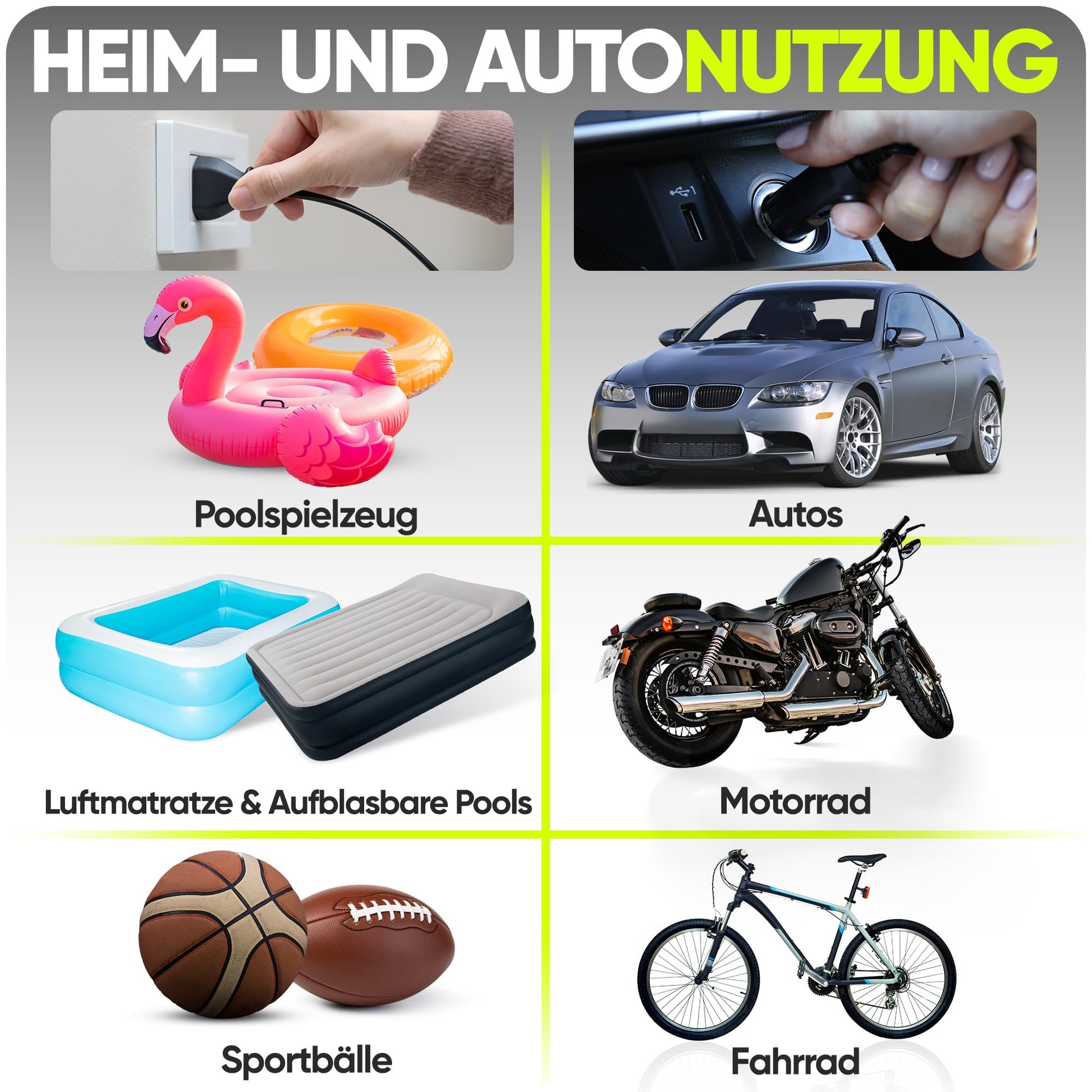 Versatile - Perfect for car tires as well as truck, SUV, and motorcycle tires. Includes three nozzle attachments for sports balls, air mattresses, pool toys, and other inflatable items. Can also be used as a bike pump. This car air pump is compatible with all vehicles with a DC-12V cigarette lighter socket. Also includes an adapter for compatibility with a 230V AC outlet. For use at home and in the car.