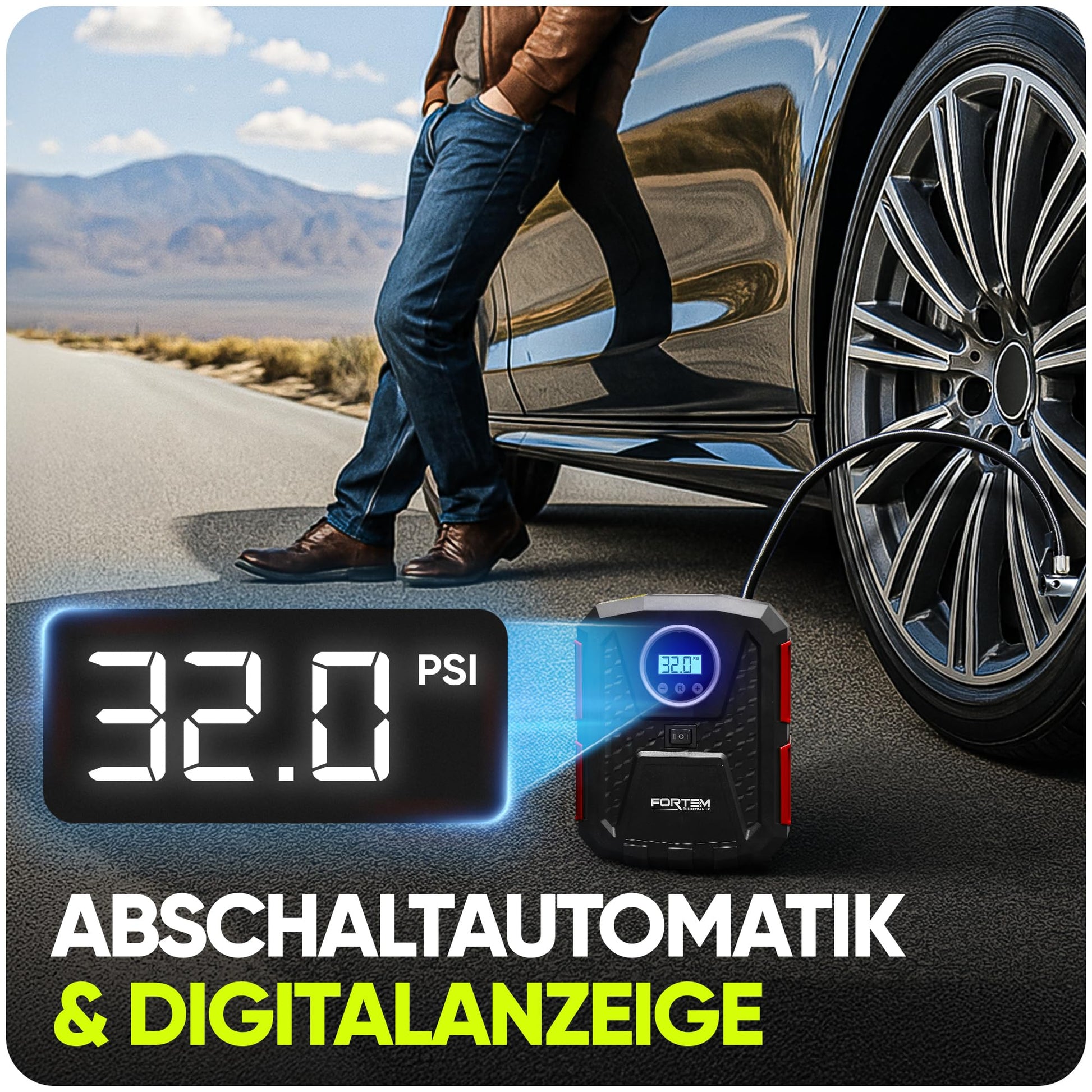 FORTEM Portable Compressor for Car Tires, 230V Adapter, 12V Car Tire Pump, and electric bike pump with LED light - Digital Tire Pressure Gauge Automatic Pump/Shut Off.