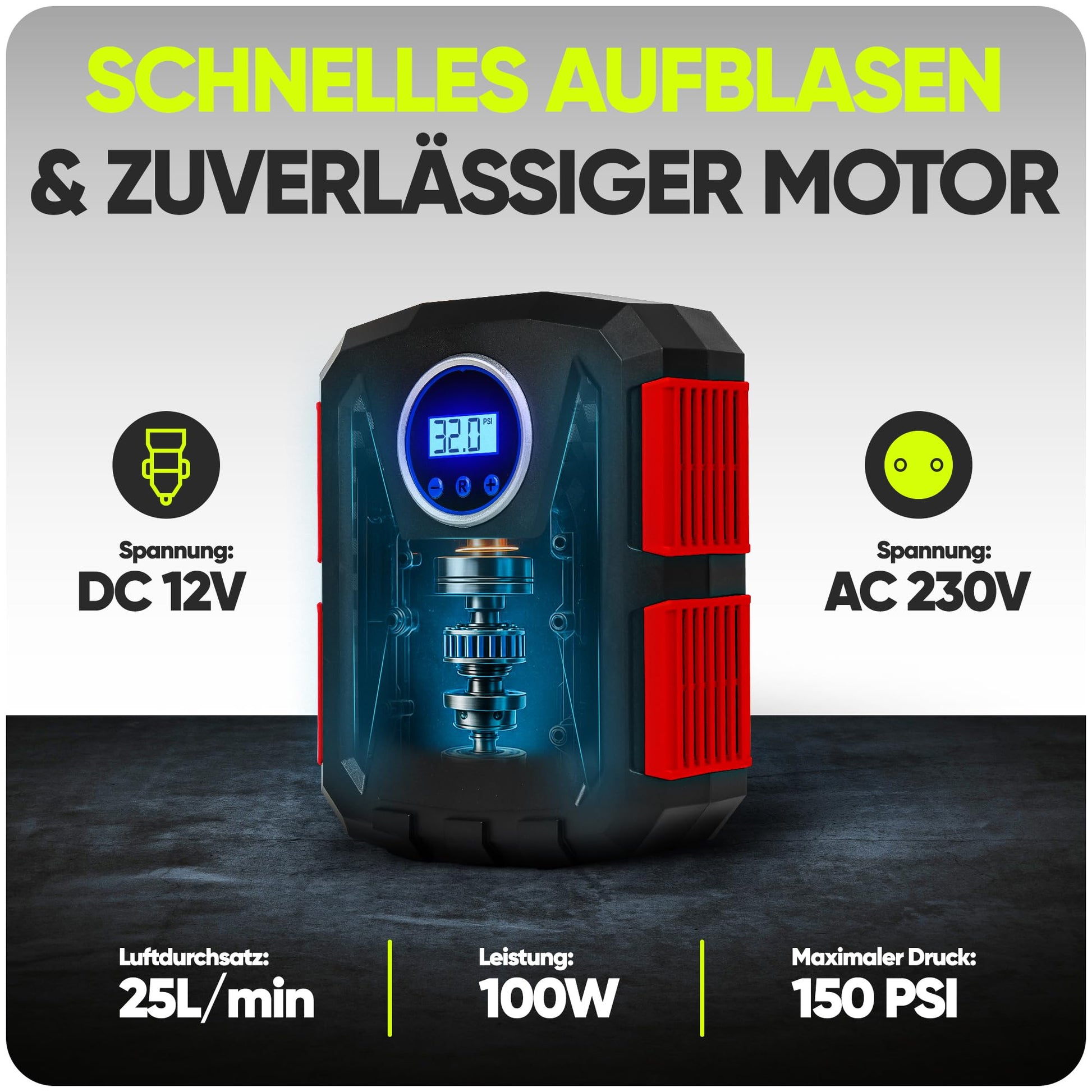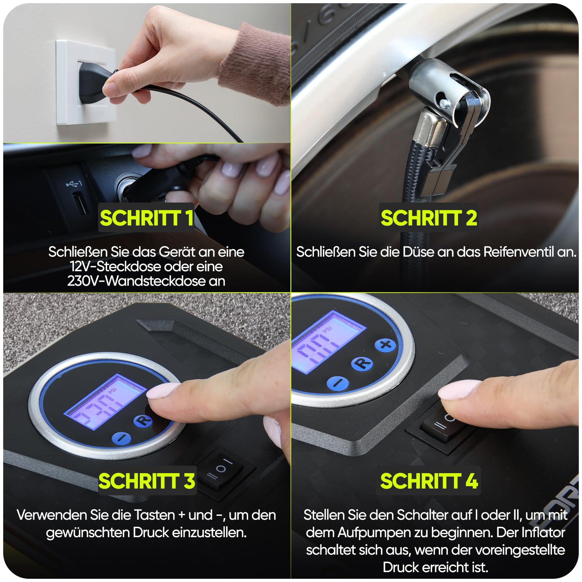 Easy operation - Turn on your vehicle's ignition, plug the compressor 12V air pump into the DC-12-volt socket, set the desired PSI value, and wait for the display to stop blinking. Turn on the switch. The device will then pump air and automatically shut off once the pressure is reached. The inflator works just like at home with a 230V adapter, simply plug it into the outlet."