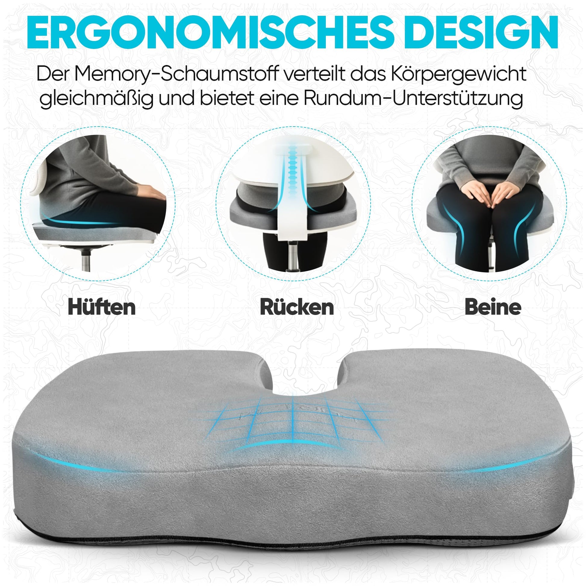 ["100% Memory Foam: Our office chair seat cushion is made of 100% pure memory foam, which is both soft and firm. It conforms to your body and features an ergonomic, U-shaped hollow design for maximum comfort.","Practical Design: The non-slip rubber bottom ensures that the chair cushion stays securely in place, even when you move. The machine-washable cover makes cleaning easy - simply remove and toss in the washing machine. An integrated handle allows you to take the seat cushion anywhere.","Versatile Use: This seat cushion is designed for a variety of chairs, including office chairs, car seat cushions, gaming chairs, and bleachers. Whether for business trips, sports events, or home use, it is a perfect wedge cushion for extra seating comfort and height.","Durable Materials: The memory foam in this seat cushion chair is designed for long-lasting use and quickly returns to its original shape after each use. Its sturdy structure ensures that it remains a reliable gaming seat cushion that provides consistent comfort over extended periods of time.","Thoughtful Gift: This office seat cushion for long periods of sitting is ideal for people of all ages and can be used in dorm rooms, offices, bedrooms, kitchens, and more. It is a great birthday or Christmas gift for family, friends, colleagues, grandparents, or teenagers, providing a comfortable car seat cushion for any occasion."]