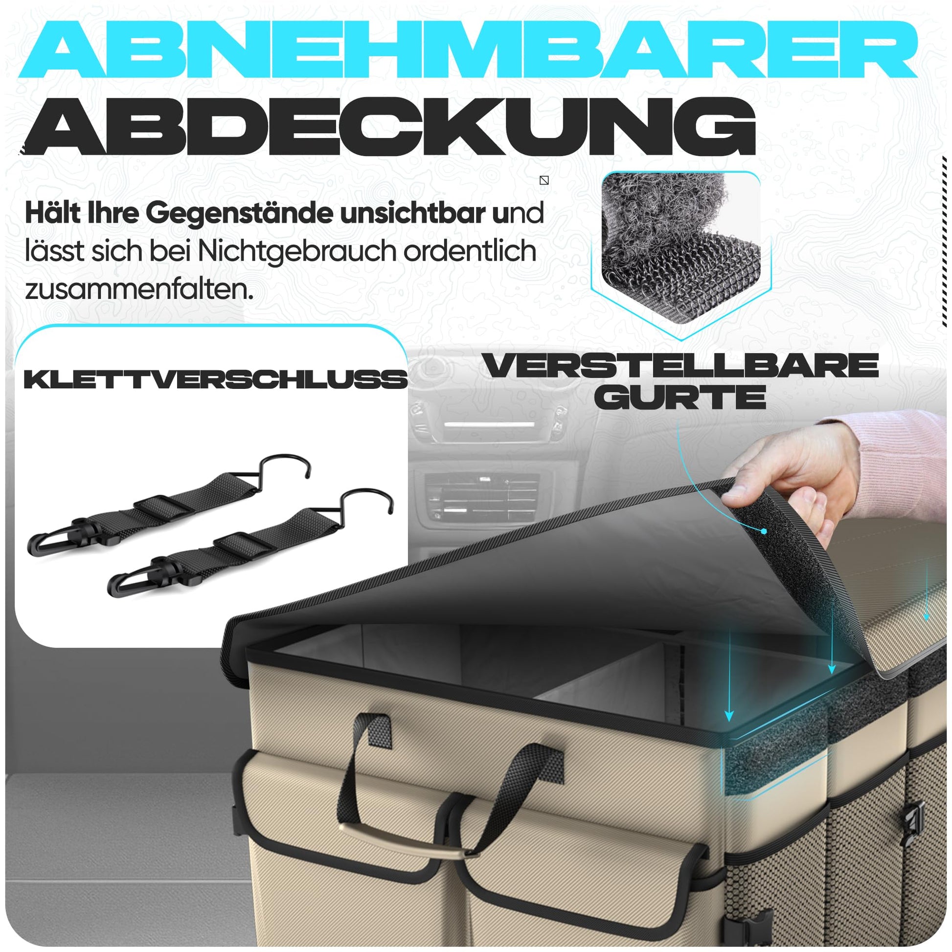 Foldable car trunk bag with removable cover - You can also use the trunk bag as a back seat or front passenger seat organizer and place it in the middle of your vehicle, as it folds down to 1 compartment. The removable cover ensures that your items are not visible and provides additional security."