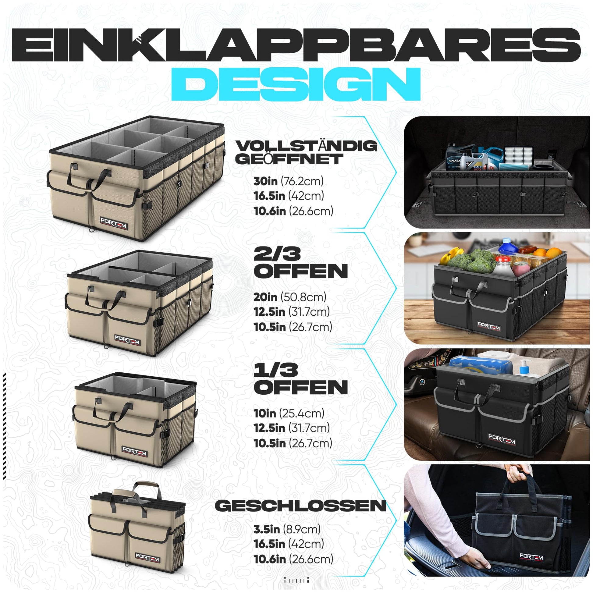 Multifunctional car trunk bag - The Fortem trunk boxes make organization in the car easy and simple. Organize a variety of items, from food to office supplies, accessories (handbags, shoes), or children's toys. Bring order to your trunk and make room for your cooler or camping gear.