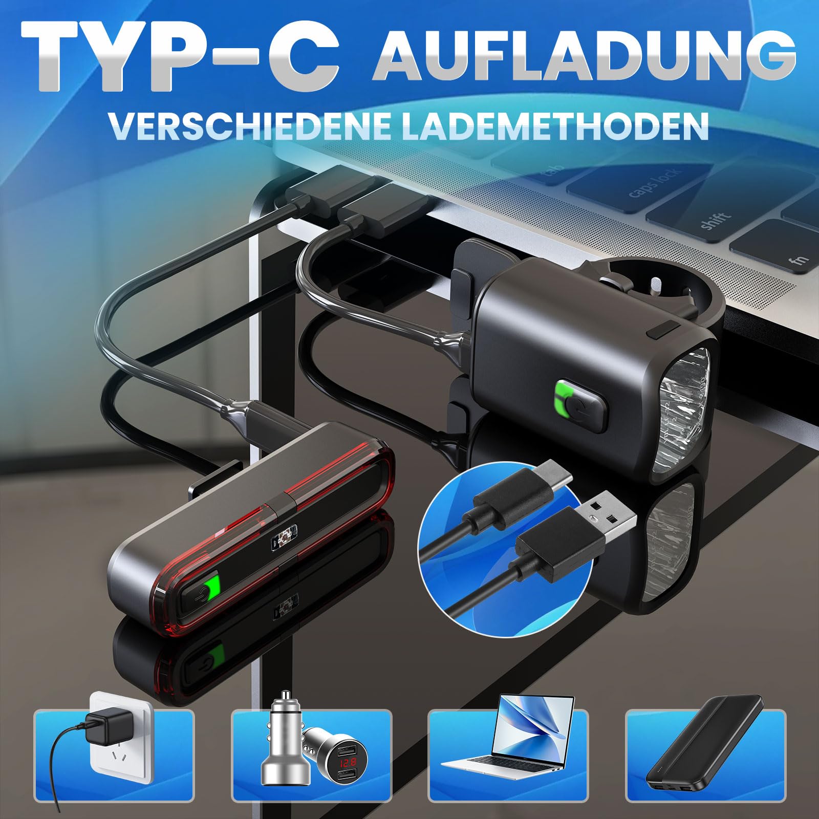 ["TYPE-C CHARGING: The bike light set uses Type-C charging, which is very convenient whether connected to a PC, outlet, or mobile power supply."],