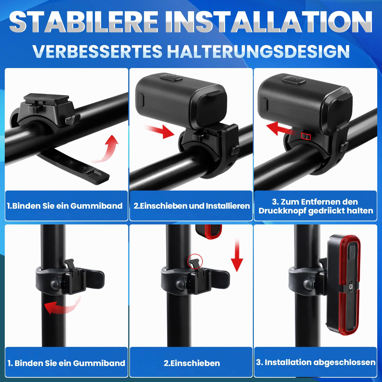 ["STVZO CERTIFIED AND GLARE-FREE: The bike light set is StVZO certified and features a glare-free design to prevent blinding oncoming pedestrians or vehicles. Stay visible while riding at night for a safe journey."],