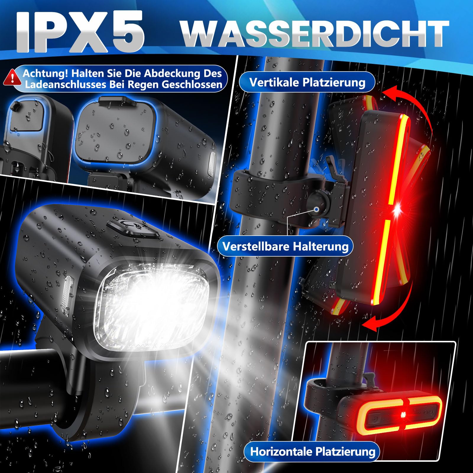 ["IPX5 WATERPROOF: The bike light set is IPX5 waterproof, and the USB port is also equipped with a waterproof silicone cover to protect the charging port. However, do not ride in heavy rain."],
