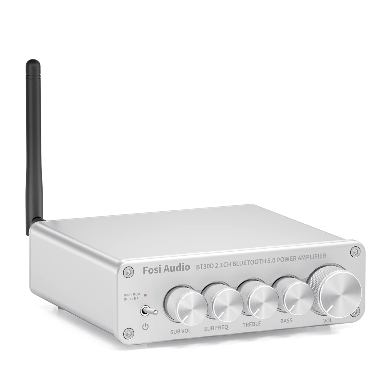 Fosi Audio BT30D-S Bluetooth 5.0 amplifier 50 Watts x2 + 100 Watts Mini Hi-Fi Stereo Audio Class D 2.1 Channel Integrated Amplifier for Home Outdoor Passive Speakers Passive/Powered Subwoofer (Silver)