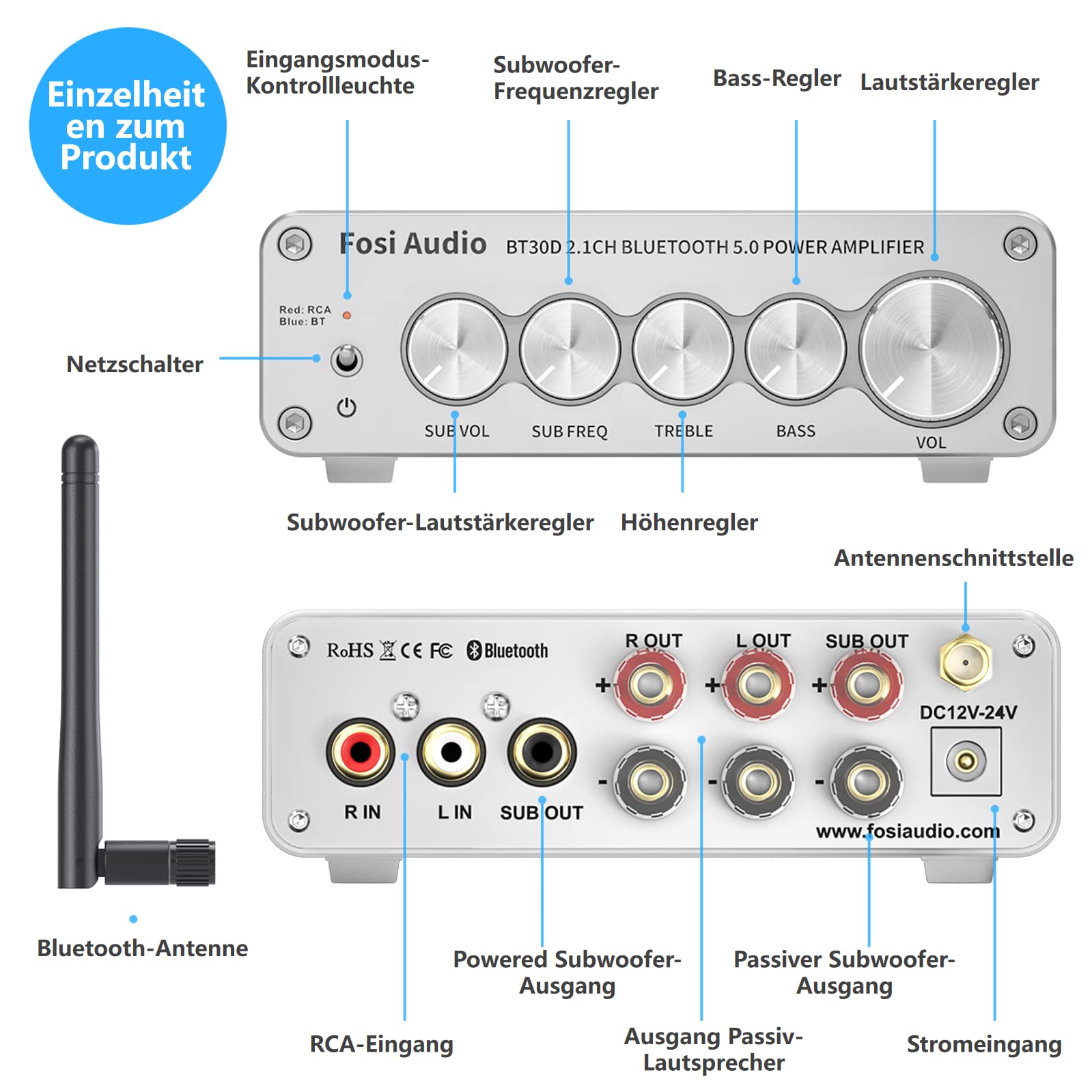"Easy operation and updated version: Fosi audio BT30D-S Bluetooth 5.0 amplifier is an updated version for BT30D, perfect for DIY excellent home audio system you wanted. 2.1CH Bluetooth 5.0 power amplifier. A new generation: exquisite design, improved operation, great sound performance. Applicable for Bluetooth and RCA input: BT30D-S supports Bluetooth and RCA input and can drive most passive home speakers and passive/powered subwoofers. SUB volume/frequency, bass/treble control ensure Hi-Fi music quality. 2 pieces Texas Instruments TPA3116D2 chip. High power effectively improves output power and audio quality. Maximum output power up to 200W. What you get: BT30D-S Amp, 24V/4.5A power supply, user manual, our worry-free packageWhat you get: BT30D-S Amp, 24V/4.5A power supply, user manual, our free 24-month warranty and friendly customer service."